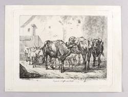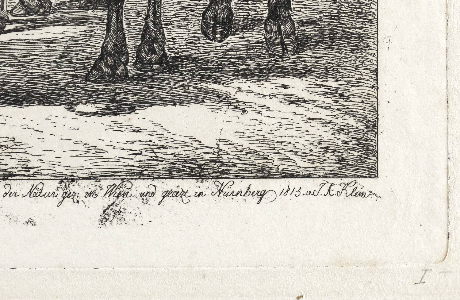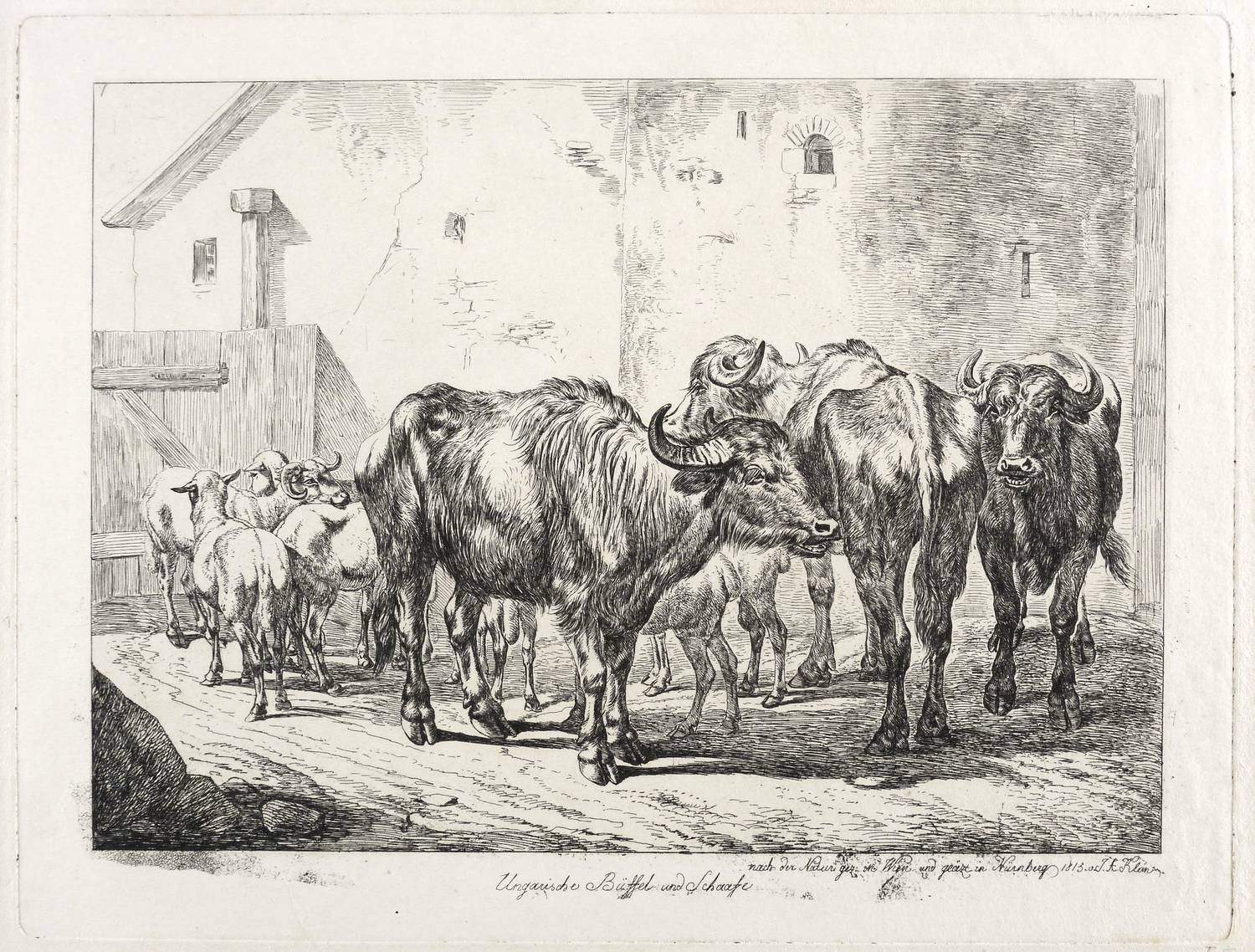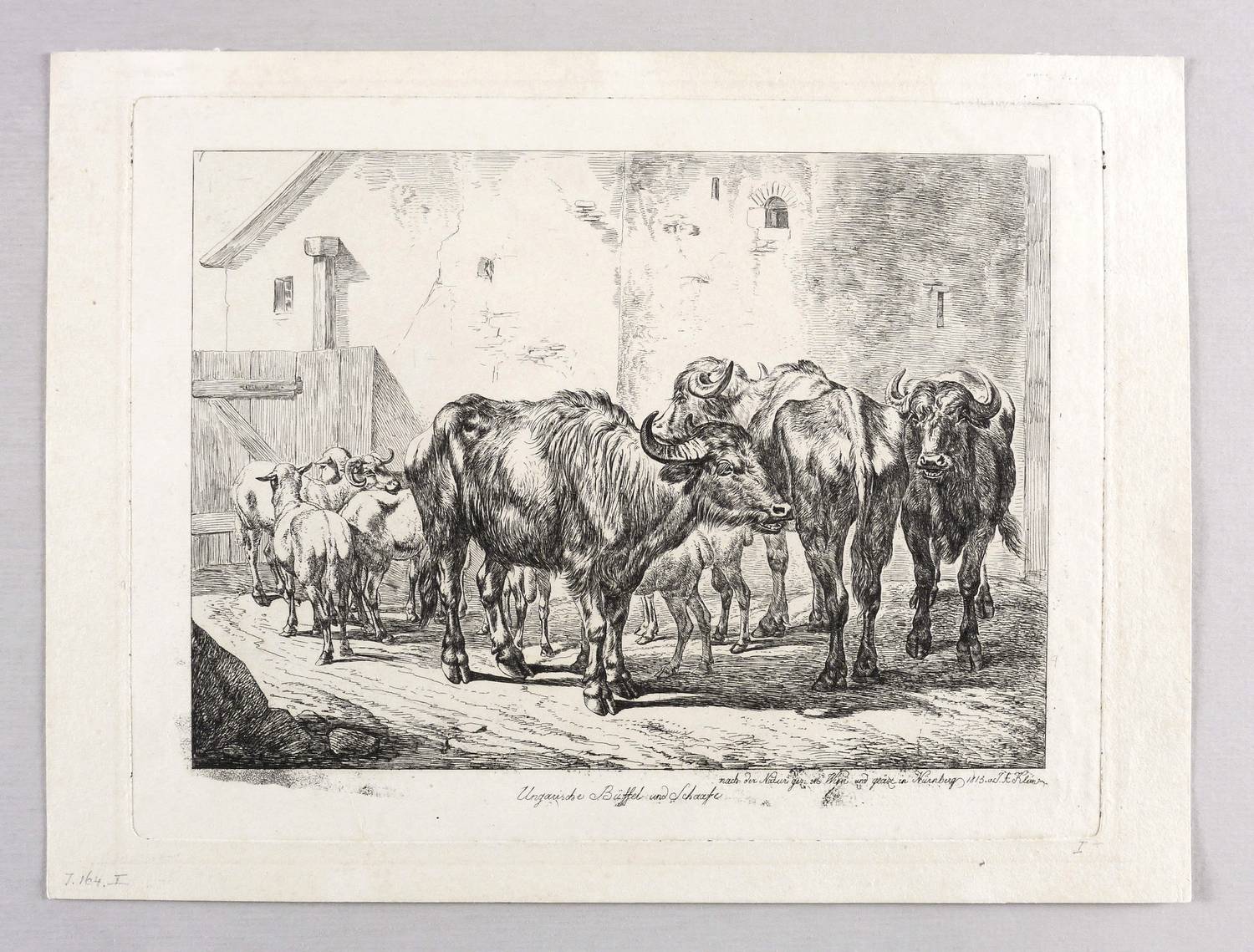 Jahn 164 III (von III). – In der Platte rechts unten signiert & datiert: ″nach der Natur gez: in Wien und geäzt in Nürnberg 1815 v. J.A. Klein″. – Bei Jahn beschrieben als: ″Ungarische Büffel und Schaafe in einem durch ein Thor geschlossenen Hofraum bei Gebäuden stehend. Es sind sieben Schafe und drei Büffel, von welch letzteren einer nach rechts, der zweite von dem Betrachter abwärts und der dritte diesem zugewendet steht.″ – Diverse Lager- und Altersspuren. Kaum merklicher Lichtrand. Guter Zustand.