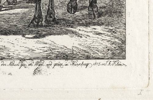 Johann Adam Klein (1792 Nürnberg - 1875 München). Deutscher Maler und Radierkünstler des Biedermeier. Erster Zeichenunterricht mit 8 Jahren bei dem Maler Georg Christoph von Bemmel. Ab 1805 Lehrling im Atelier des Kupferstechers Ambrosius Gabler. 1811 Schüler der von Gustav Philipp Zwinger geleiteten Nürnberger Zeichenschule. 1811-18 Studium an der Kunstakademie in Wien. Während einer Reise an Rhein und Main 1815 Begegnung mit dem Werk des Malers Wilhelm von Kobell. 1818 Reise ins Salzkammergut mit Johann Christoph Erhard, den Brüdern Friedrich Philipp und Heinrich Reinhold und Ernst Welker. 1819/20 Italienaufenthalt. 1839 Umsiedelung nach München und Heirat der Tochter des Kupferstechers Wolf. Mit seinen zahlreichen Tierstücken zählt Klein zu den wichtigsten Radierkünstlern des frühen 19. Jahrhunderts.
