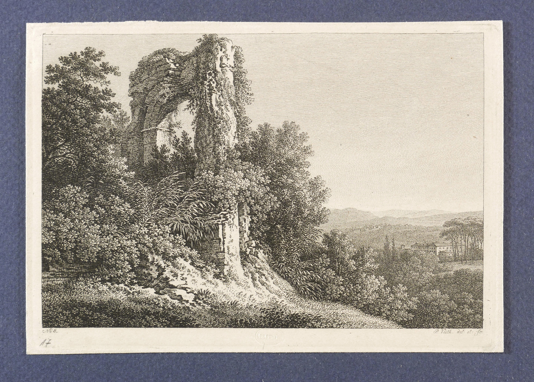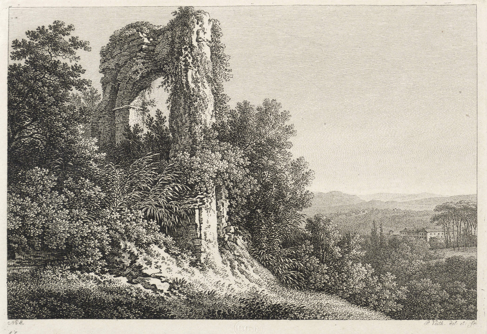 Aus: Johann Philipp Veith, Arbeiten der Musse. Ouvrages des Loisier (Dresden: Morasch & Skerl 1822). – In der Platte rechts unten signiert: "P. Veith del. et sc." Links nummeriert: "No. 8". – Ideale Ansicht aus der Umgebung Roms, wo sich Veith 1802 zu Studienzwecken aufgehalten hat. – Mit knappem Rand um die Platte. Papier geringfügig gewellt. Verso Montagereste. Guter Erhaltungszustand.