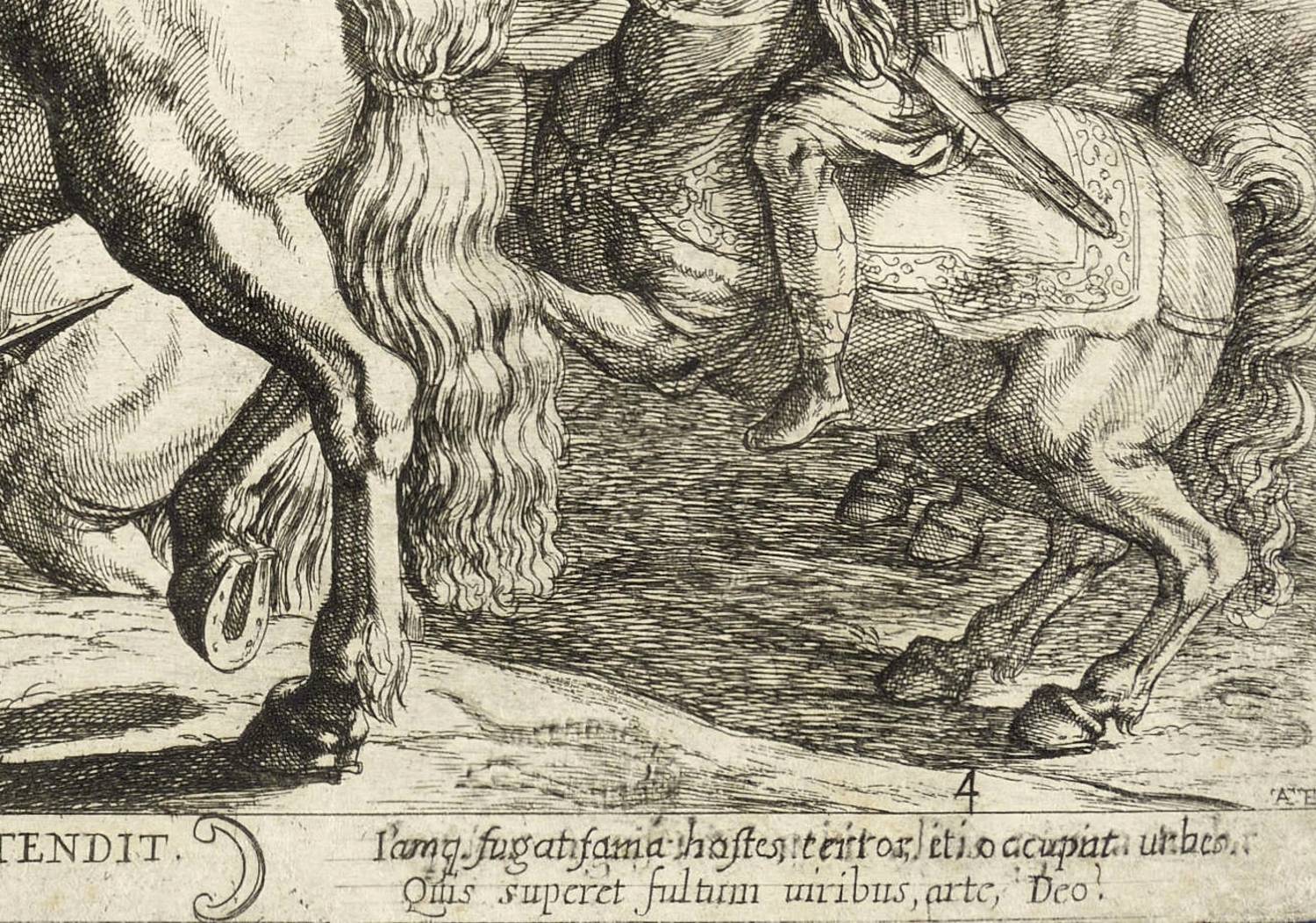 Bartsch 239. – In der Platte rechts unten signiert: ″A. TE.″ Links daneben nummeriert: ″4″. Unterhalb mittig Titel sowie seitlich die Verse: ″Isacidum dux ille, Dco propiore beatus / AEthiopum crebro milite uastat agros. // ...″ Verso ein schwer auflösbarer Sammler-Stempel, wohl: ″LELOUTRE [...] PARIS″. – Aus einer Serie Biblischer Schlachten, die 1613 bei Nicolas van Aelst in Rom verlegt wurde. – Blatt auf die Plattenkante beschnitten. Knappes Rändchen um die Einfassungslinie der Darstellung. Minimal fingelfleckig. Verso leichte Montagereste. Insgesamt guter Erhaltungszustand.
