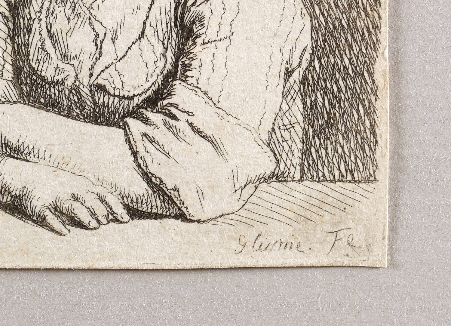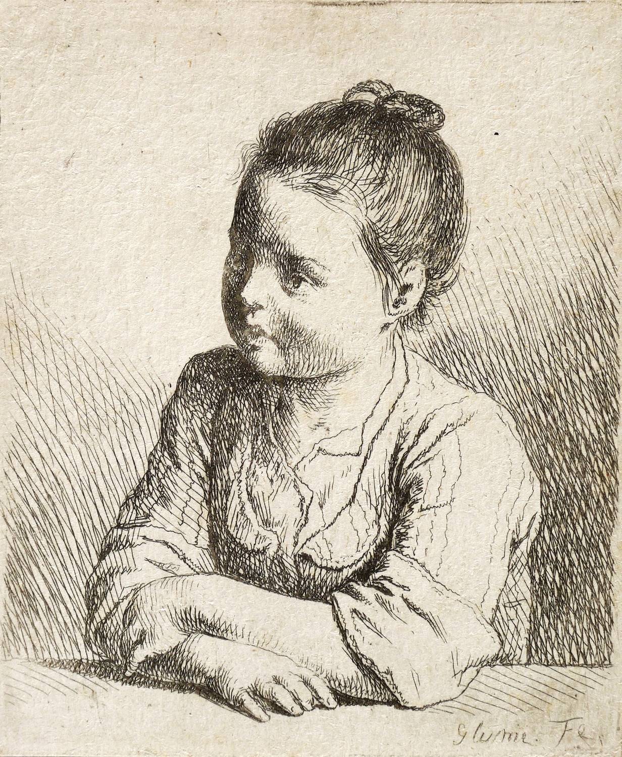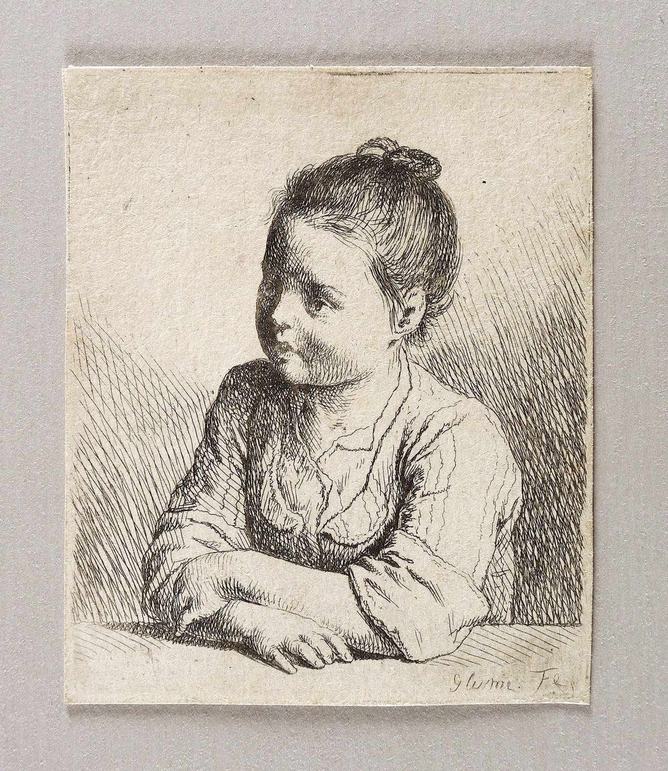 Soldan 18. Heller-Andresen 12. – In der Platte rechts unten signiert: ″Glume Fe″. Verso Sammlerstempel in Blau (ähnlich Slg. August Dorgerloh, Lugt 2744). – Blatt aus der bekannten Radier-Folge von acht Kinderbüsten bzw. Kinderproträts des Künstlers. – Umlaufend knapp auf die Plattenkante geschnitten. Leichte Altersspuren. Sehr guter Zustand.