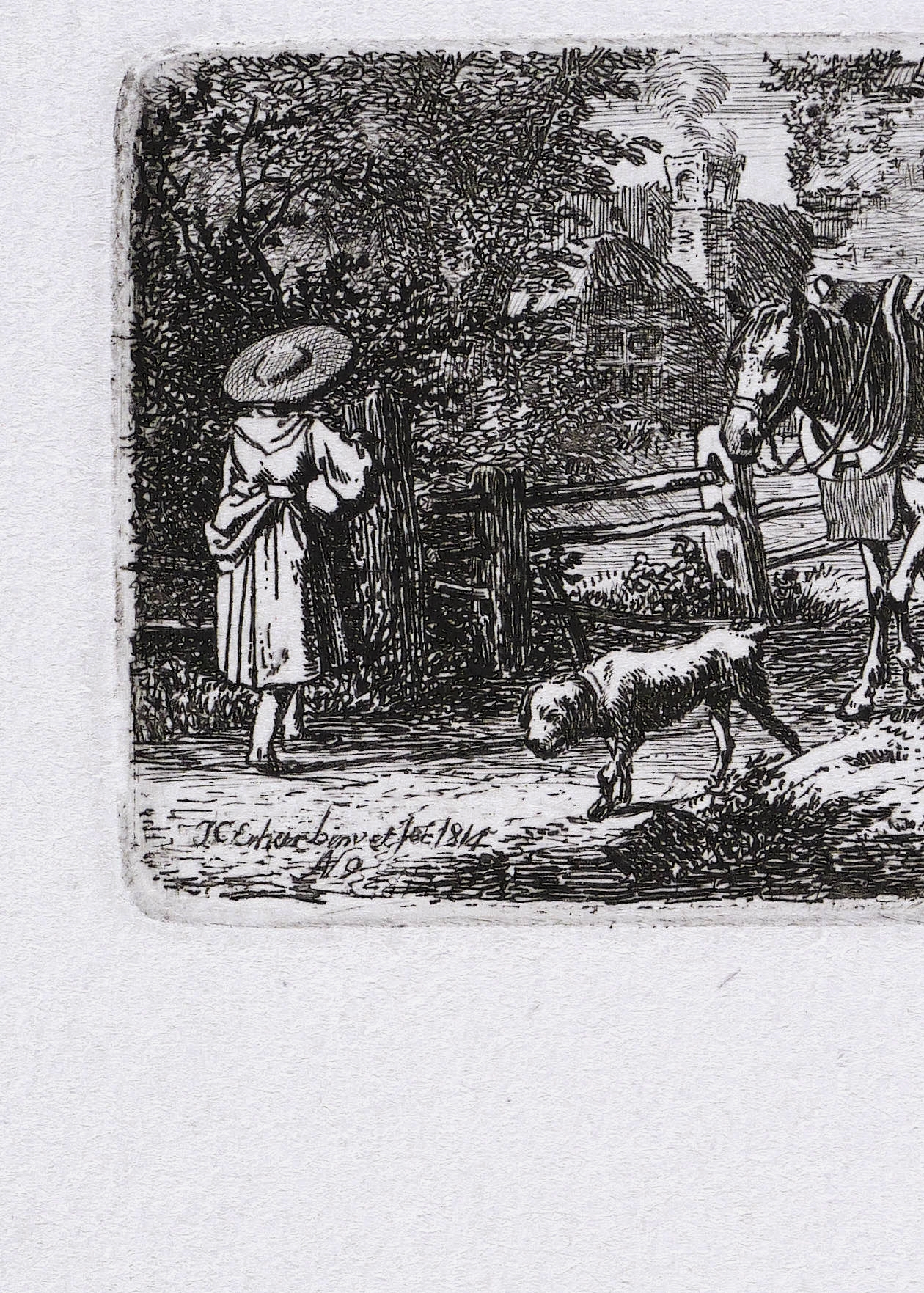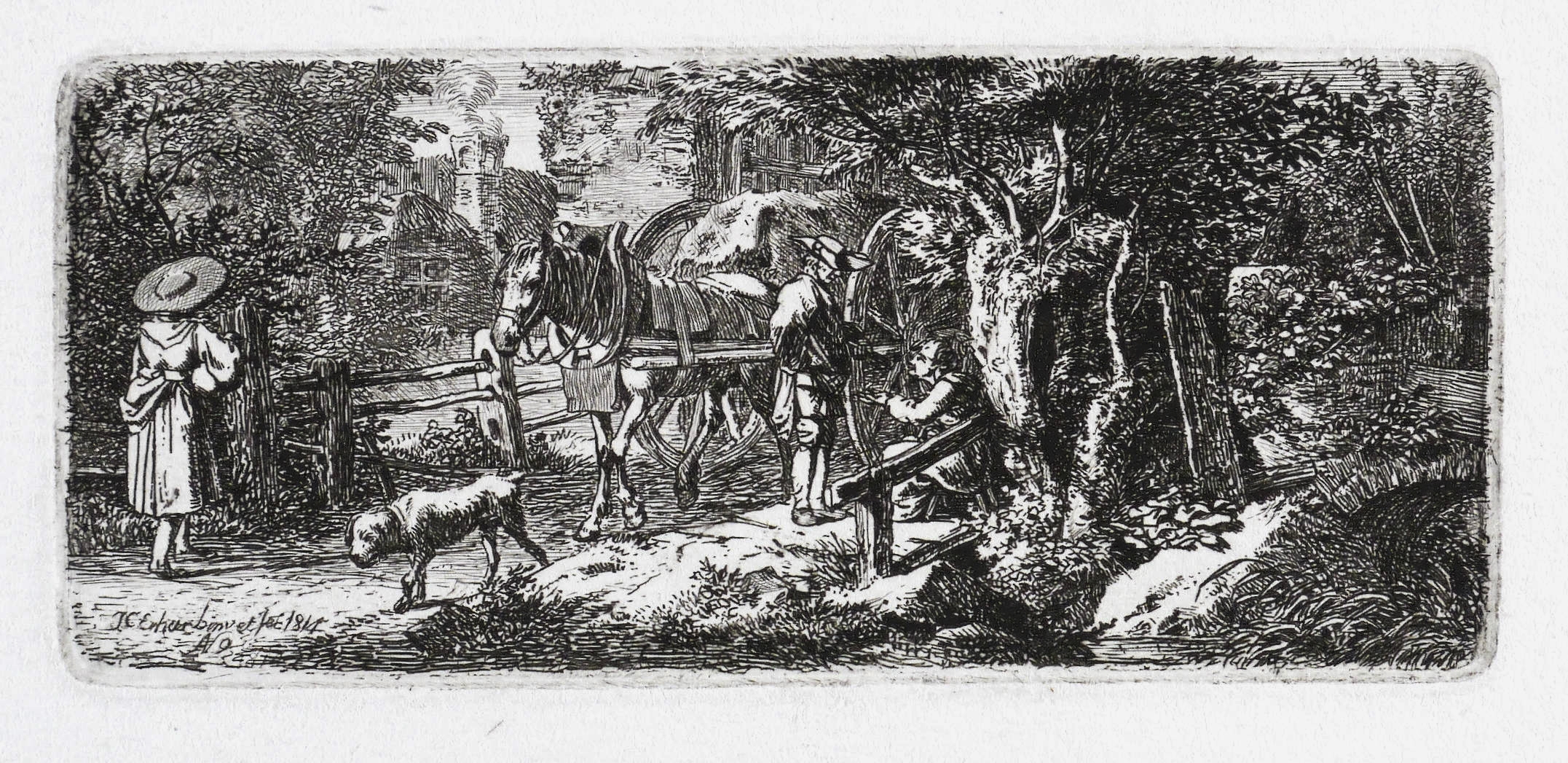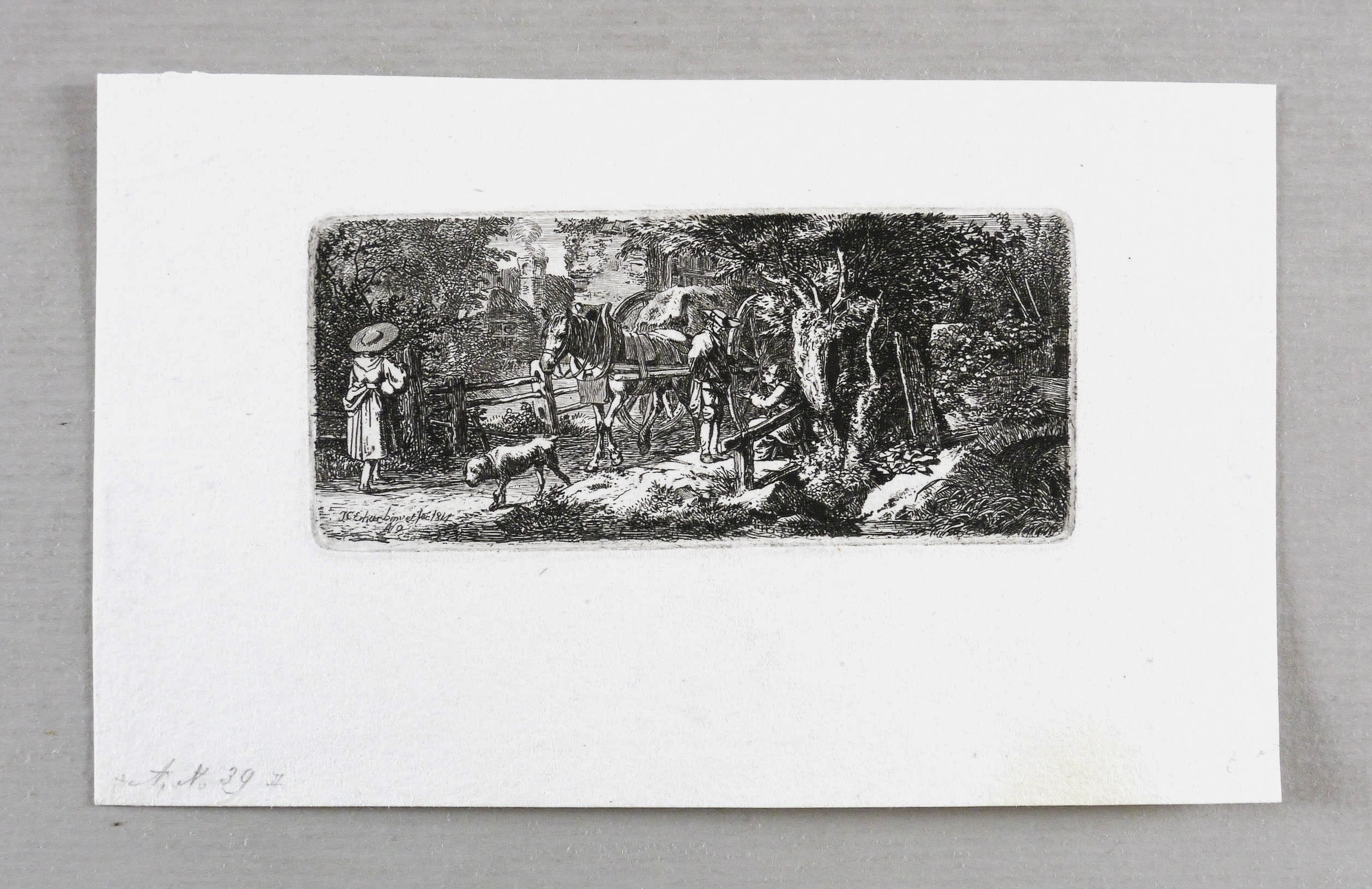 Apell 39 II (von II). – In der Platte links unten signiert und datiert: ″J.C. Erhard inv. et fec. 1814″, darunter: ″N. 9″. In der Blattecke links unten leicht verblassend in Bleistift bezeichnet: ″A[pell]. N. 39 II″. Verso weitere Sammlernotizen. – Bei Aloys Apell beschrieben als: ″Auf einer Brücke hält ein mit einem Pferde bespannter Fuhrmannskarren, dessen Fahrer im Begriff ist, einer, an einer Weide sitzenden Bettlerin ein Almosen zu spenden (...)″. – Provenienz: Sammlung Friedrich Julius Arndt (genannt Fritz Arndt, 1856-1919, Besitzer des Klosterguts Oberwartha bei Dresden), danach Sammlung Dr. Theodor Arndt, Dresden- Blasewitz. – Sehr guter Zustand.