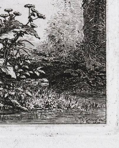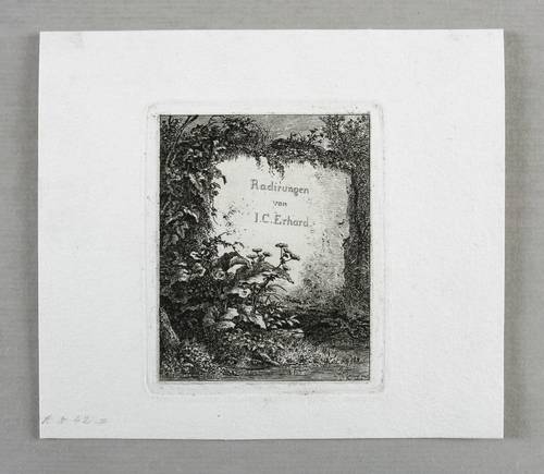 Apell 42 III (von III). – In der Platte rechts unten signiert und datiert: ″J.C. Erhard inv. et fec. 1814″. Zentral im Stein Titel-Inschrift: ″Radirungen von I.C. Erhard″. In der Blattecke links unten leicht verblassend in Bleistift bezeichnet: ″A[pell]. N. 42 III″. – Titelblatt für die Folge ″Radirungen″. – Dritter und letzter Zustand der Vignette mit der Inschrift in der Steinfläche. – Provenienz: Sammlung Friedrich Julius Arndt (genannt Fritz Arndt, 1856-1919, Besitzer des Klosterguts Oberwartha bei Dresden), danach Sammlung Dr. Theodor Arndt, Dresden- Blasewitz. – Sehr guter Zustand.