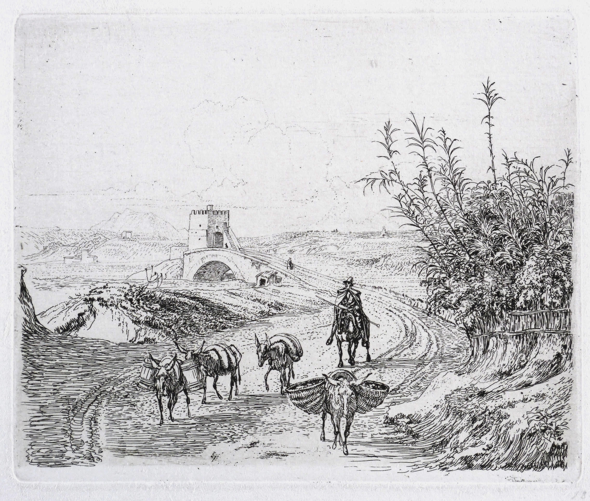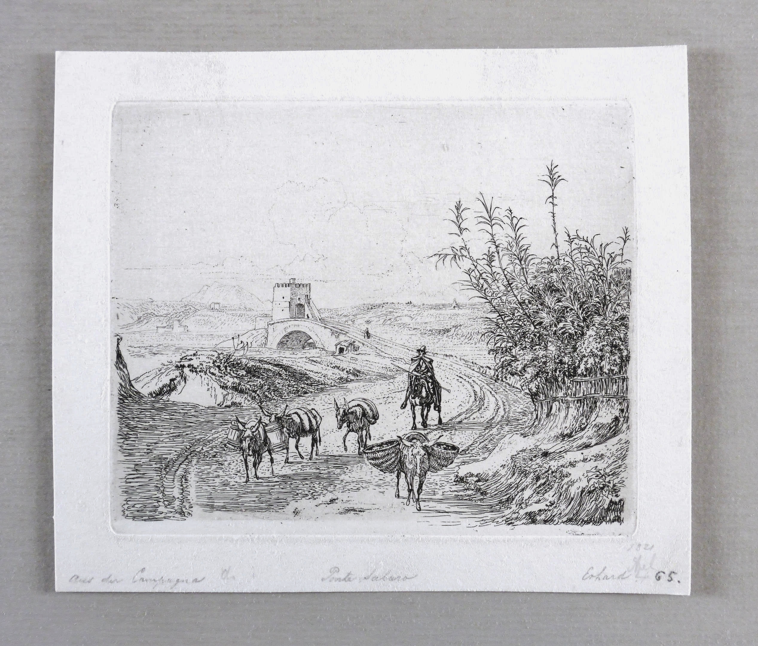 Apell 65. – Wie auch die zweite Ansicht der Folge nicht in der Platte signiert oder sonstwie bezeichnet. Im unteren Blattrand in Bleistift bezeichnet: ″Aus der Campagna / Ponte Salaro / Erhard / Apell 65″. – Provenienz: Sammlung Friedrich Julius Arndt (genannt Fritz Arndt, 1856-1919, Besitzer des Klosterguts Oberwartha bei Dresden), danach Sammlung Dr. Theodor Arndt, Dresden- Blasewitz. – Sehr guter Zustand.