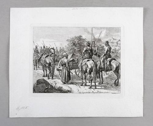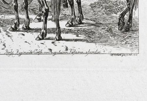 Apell 100 III (von III). – In der Platte rechts unter der Einfassungslinie signiert und datiert: ″JC Erhard gez. u. rad. 1815″. Links darüber innerhalb der Darstellung bezeichnet: ″Russ. Regiments-Casse von regulairen Kosaken escordirt″. In der linkne unterne Blattecke in Bleistift Werknummer: ″Ap[ell]. 100 III″. Verso weitere Sammlernotizen. – Detailreich druckender Abzug vom dritten Zustand der Platte mit allen Vollendungen. – Sehr schönes Blatt. – Provenienz: Sammlung Friedrich Julius Arndt (genannt Fritz Arndt, 1856-1919, Besitzer des Klosterguts Oberwartha bei Dresden), danach Sammlung Dr. Theodor Arndt, Dresden-Blasewitz. – Hervorragend erhalten. Sehr guter Zustand.
