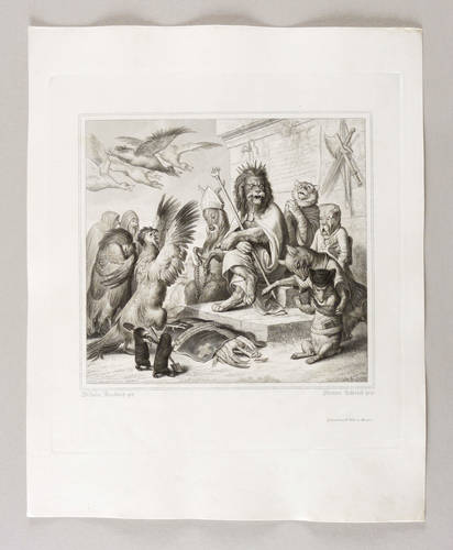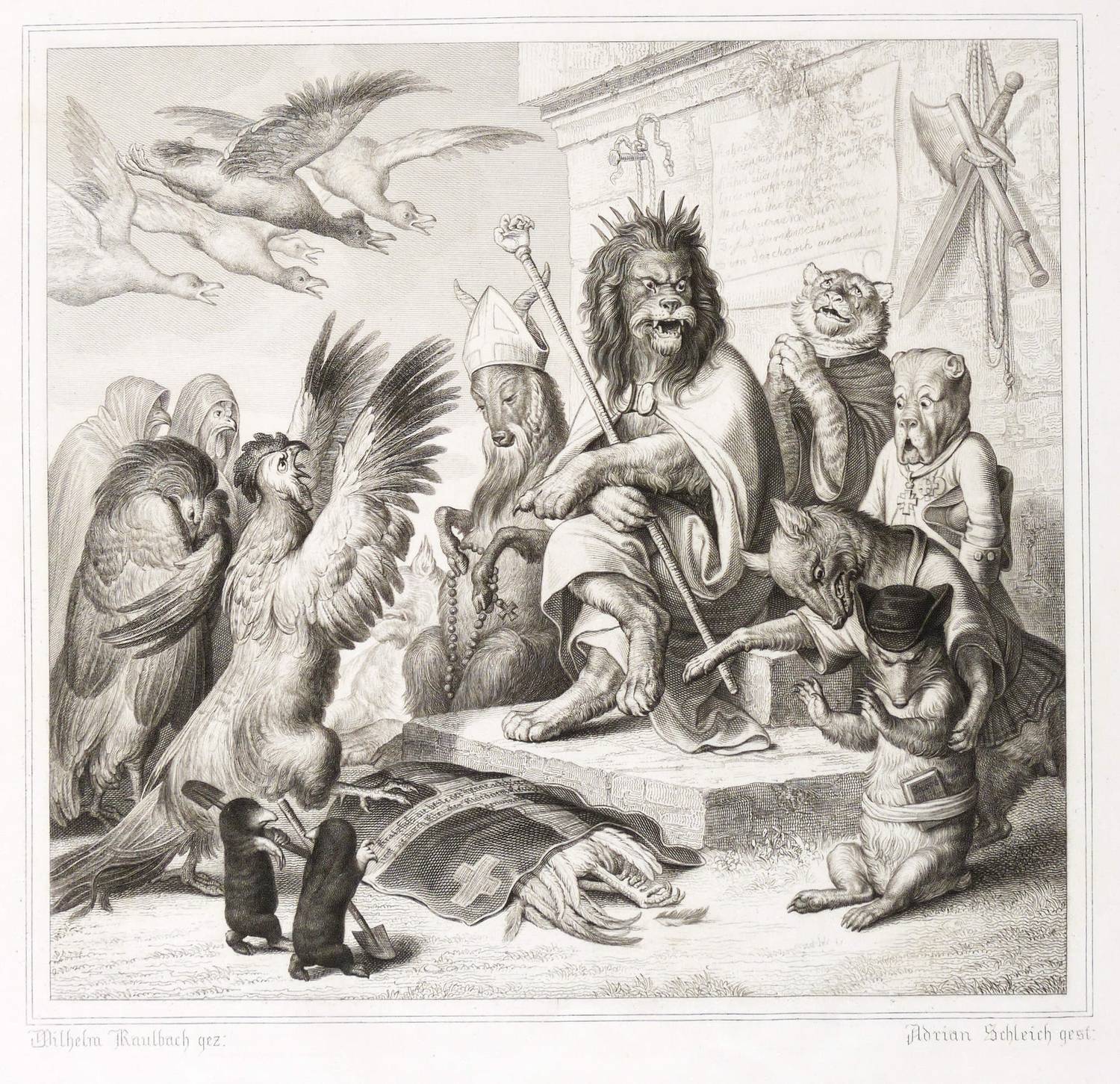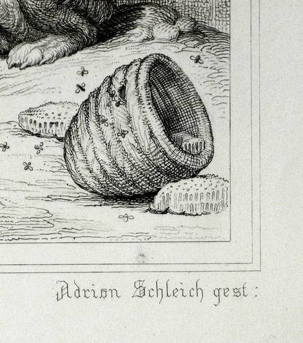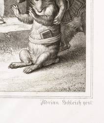 Aus: Johann Wolfgang von Goethe, Reineke Fuchs (Stuttgart und Tübingen: Cotta'scher Verlag 1846). – Rechts unten signiert: ″Adrian Schleich gest.″ Darunter die Adressen des Verlegers und des Druckers. – Guter Zustand.