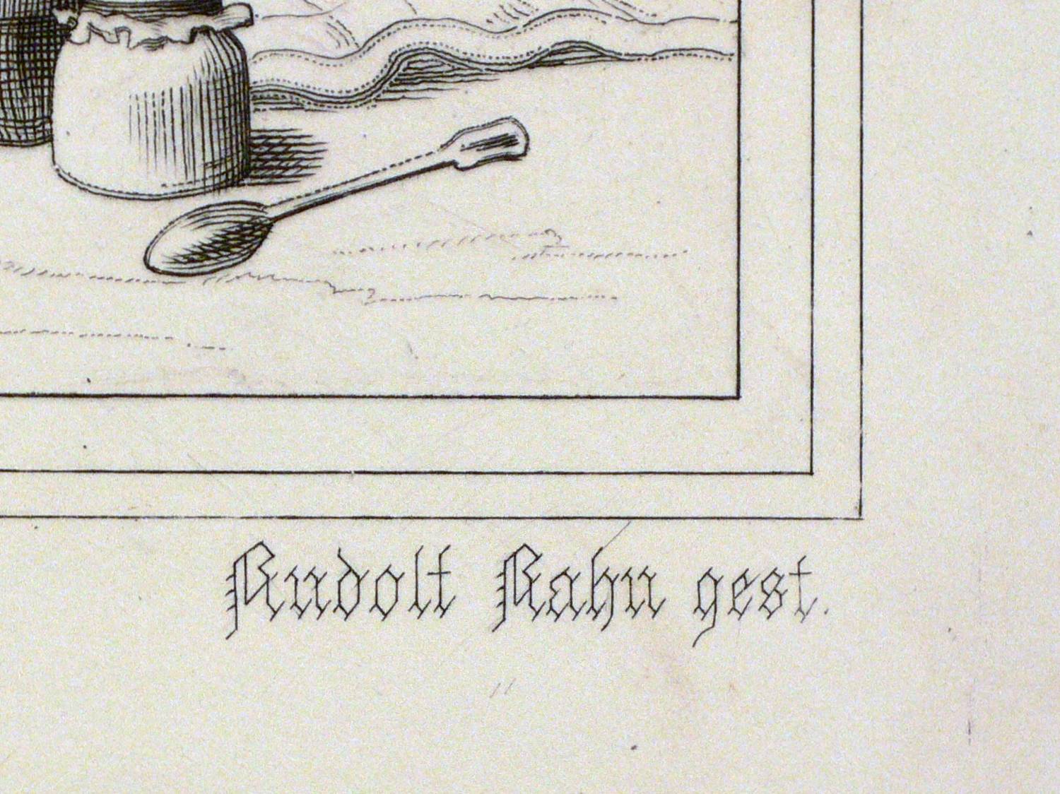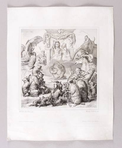 Aus: Johann Wolfgang von Goethe, Reineke Fuchs (Stuttgart und Tübingen: Cotta'scher Verlag 1846). – Rechts unten signiert: ″Adrian Schleich gest.″ Darunter Adressen des Verlegers und des Druckers. – Guter Zustand.