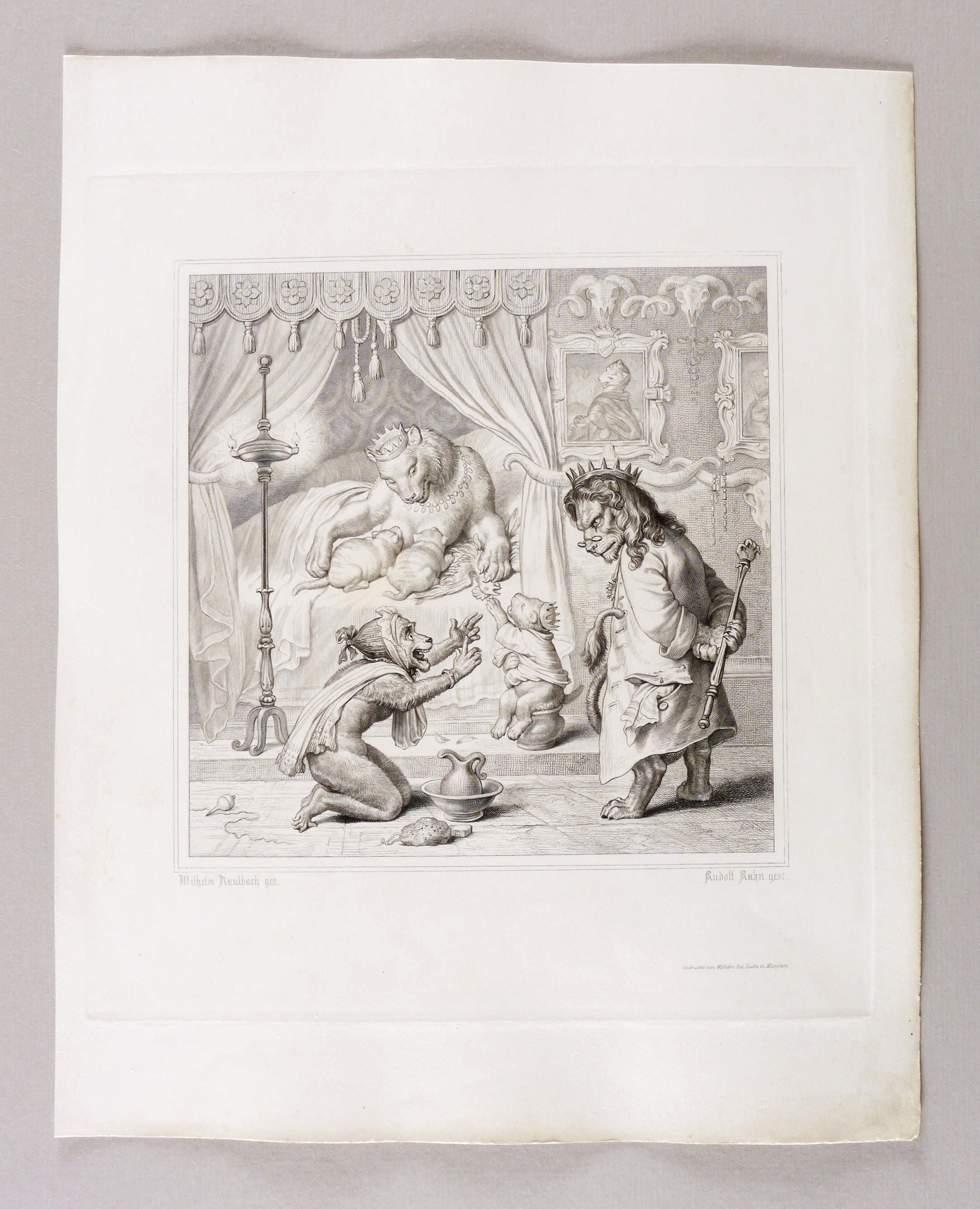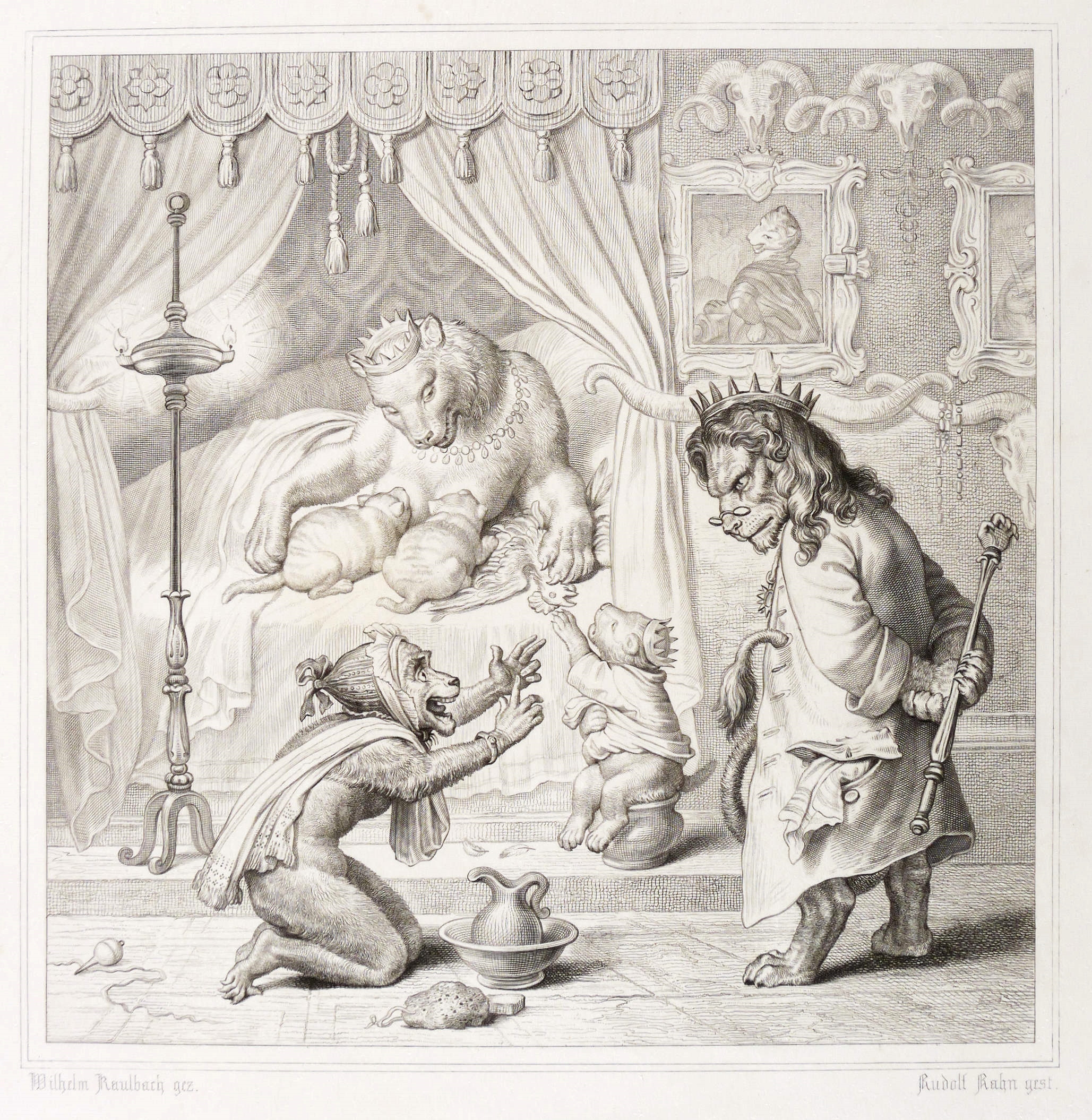 Kaulbach, Wilhelm von (nach). – Reineke Fuchs (Goethe). – Rudolf Rahn. – „Frau Rückenau die Äffin beschwört König Nobel”.