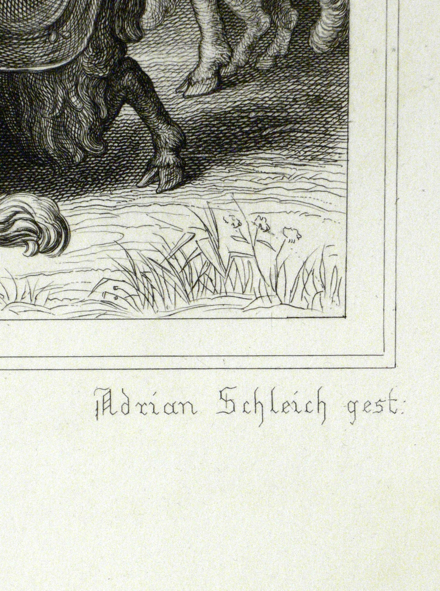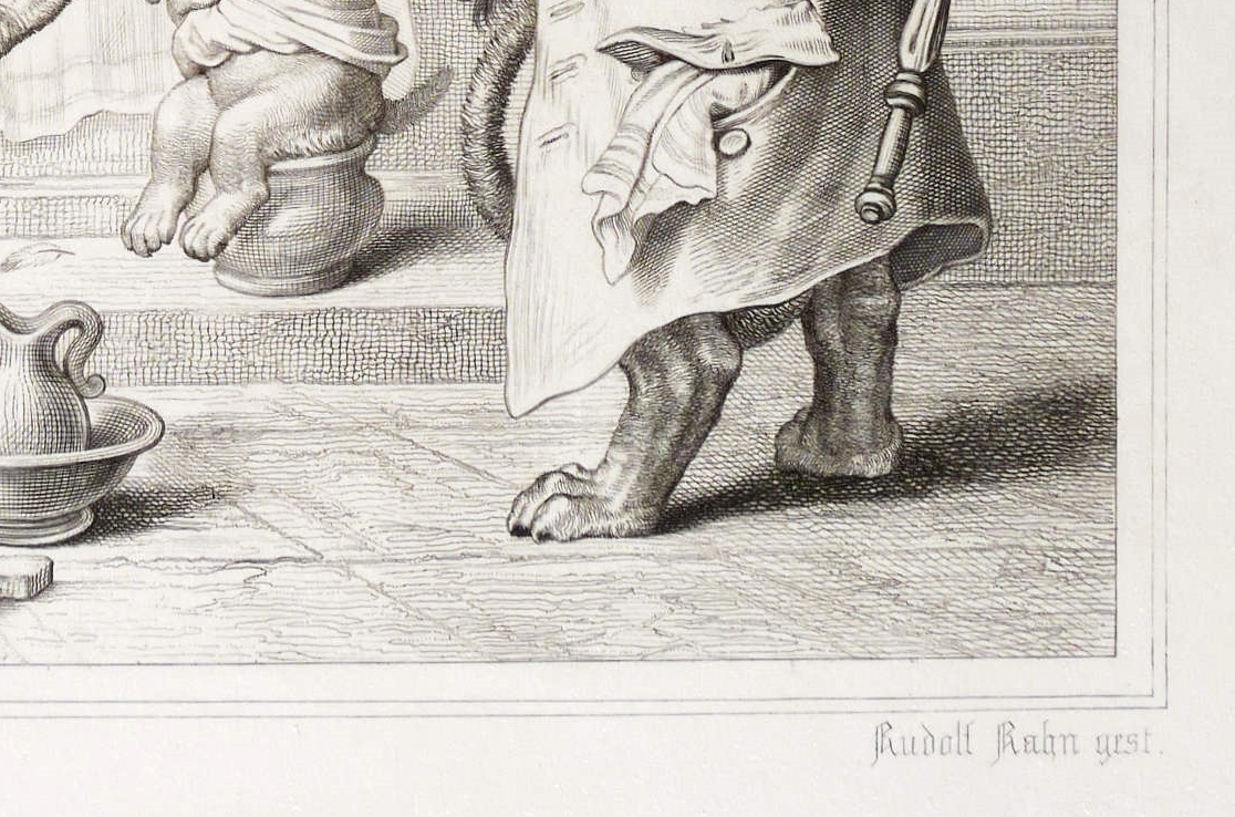 Aus: Johann Wolfgang von Goethe, Reineke Fuchs (Stuttgart und Tübingen: Cotta'scher Verlag 1846). – Rechts unten signiert: ″Rudolf Rahn gest.″ Darunter Adressen des Verlegers und des Druckers. – Guter Zustand.