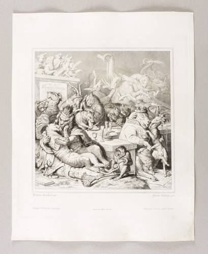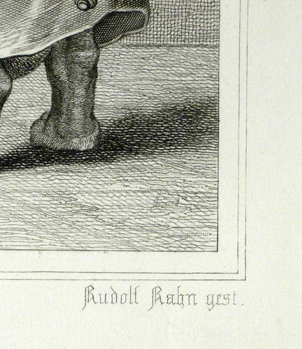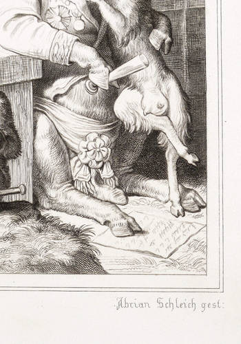 Aus: Johann Wolfgang von Goethe, Reineke Fuchs (Stuttgart und Tübingen: Cotta'scher Verlag 1846). – Rechts unten signiert: ″Adrian Schleich gest.″ Darunter Adressen des Verlegers und des Druckers. – Guter Zustand.