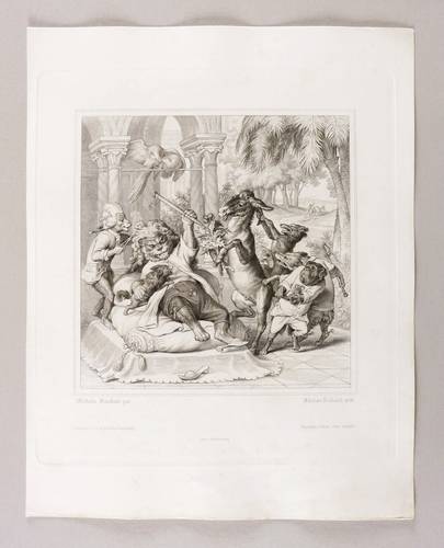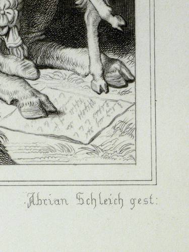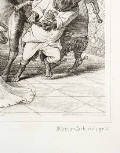 Aus: Johann Wolfgang von Goethe, Reineke Fuchs (Stuttgart und Tübingen: Cotta'scher Verlag 1846). – Rechts unten signiert: ″Adrian Schleich gest.″ Darunter Adressen des Verlegers und des Druckers. – Guter Zustand.