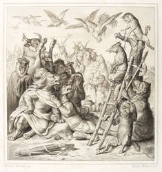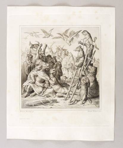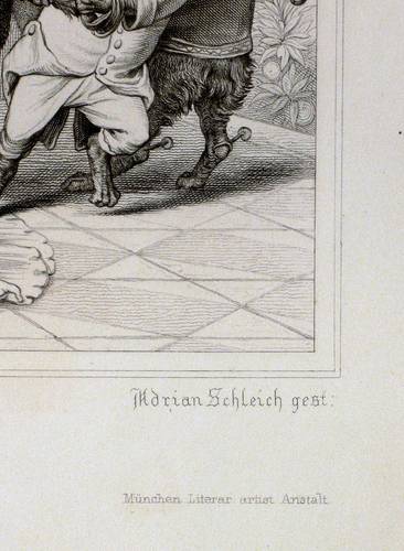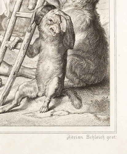 Aus: Johann Wolfgang von Goethe, Reineke Fuchs (Stuttgart und Tübingen: Cotta'scher Verlag 1846). – Rechts unten signiert: ″Adrian Schleich gest.″ Darunter Adressen des Verlegers und des Druckers. – Leicht stockfleckig. Sonst aber guter Zustand.