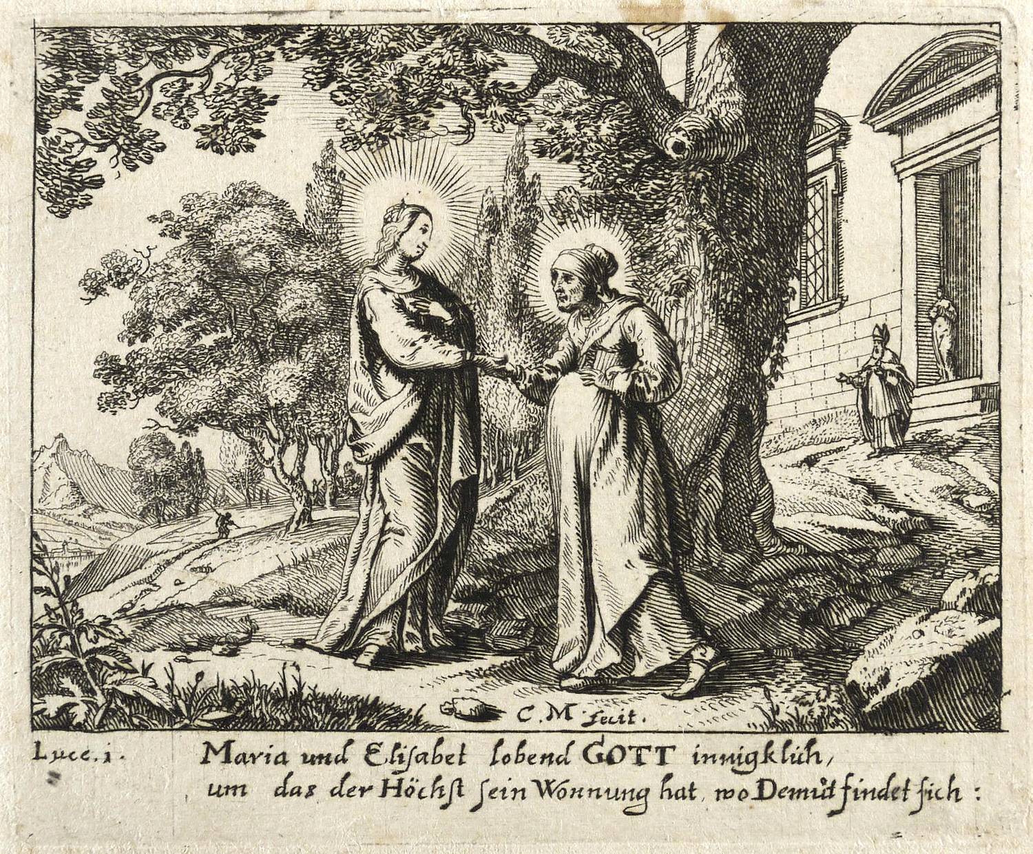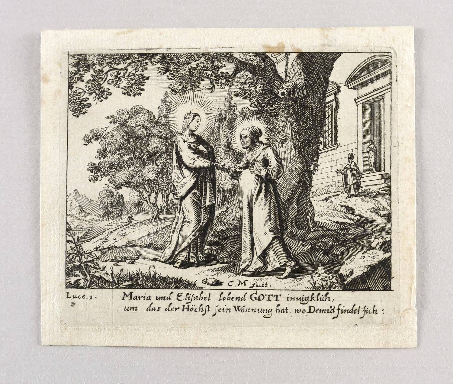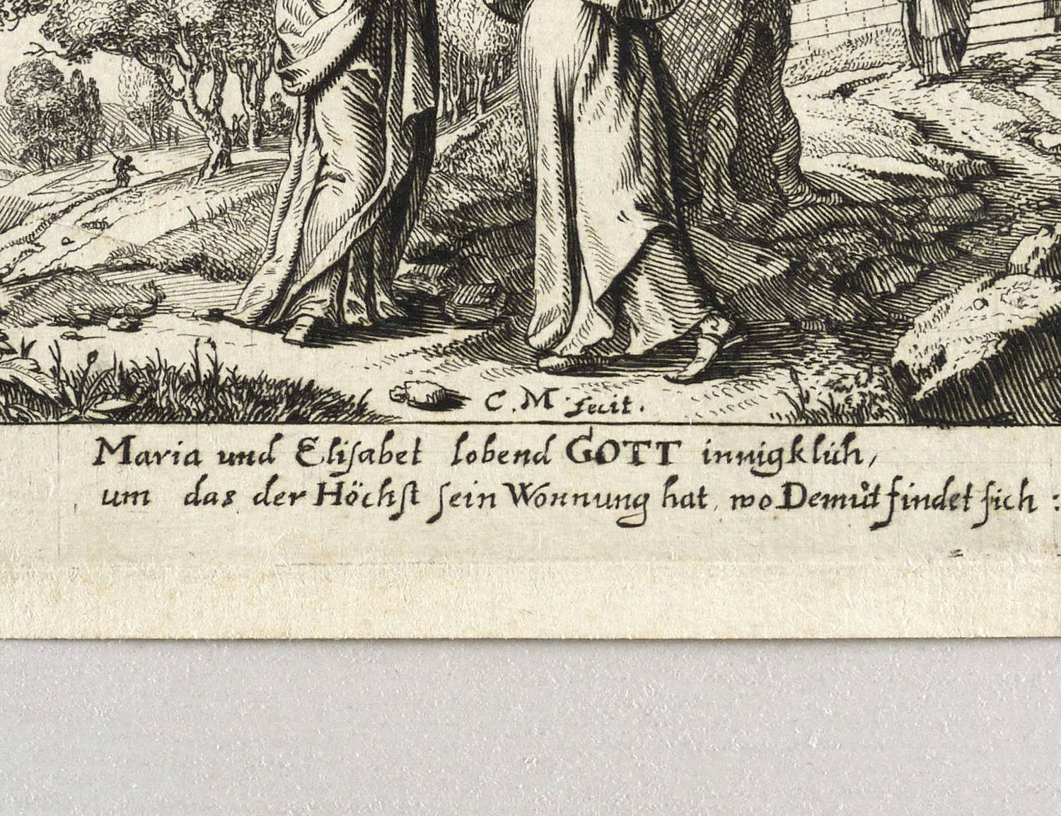 Im unteren Rand der Darstellung signiert: ″C. M. fecit.″ Darunter bezeichnet: ″Maria und Elisabet lobend Gott innigklich, um das der Höchst sein Wonnung hat, wo Demut findet sich″. – Blatt verso mit Montageresten und zwei kleineren Einrissen im rechten Rand. Linke untere Ecke leicht angeknickt. Sonst aber guter Zustand.
