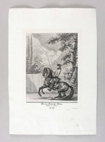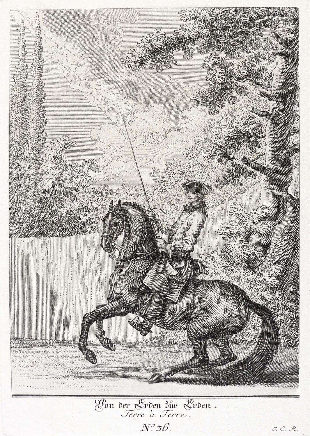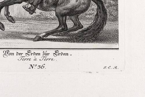 Thienemann 682. – Aus: Johann Elias Ridinger, Vorstellung und Beschreibung derer Schul und Campagne Pferden nach ihren Lectionen, In was vor gelegenheiten solche koennen gebraucht werden. (Augsburg: Johann Elias Ridinger 1760). – Rechts unten monogrammiert: ″J. E. R.″ Unterhalb der Darstellung betitelt und nummeriert: ″N.o 36.″ – Blatt mit schwachem Lichtrand und schwach fingerfleckig im unteren Rand. Sonst aber guter Zustand.