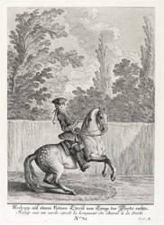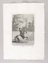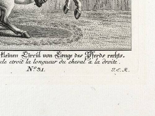 Thienemann 677. – Aus: Johann Elias Ridinger, Vorstellung und Beschreibung derer Schul und Campagne Pferden nach ihren Lectionen, In was vor gelegenheiten solche koennen gebraucht werden. (Augsburg: Johann Elias Ridinger 1760). – Rechts unten monogrammiert: ″J. E. R.″ Unterhalb der Darstellung betitelt und nummeriert: ″N.o 31.″ – Originalrandiges Blatt mit schwachem Lichtrand. Sonst aber guter Zustand.