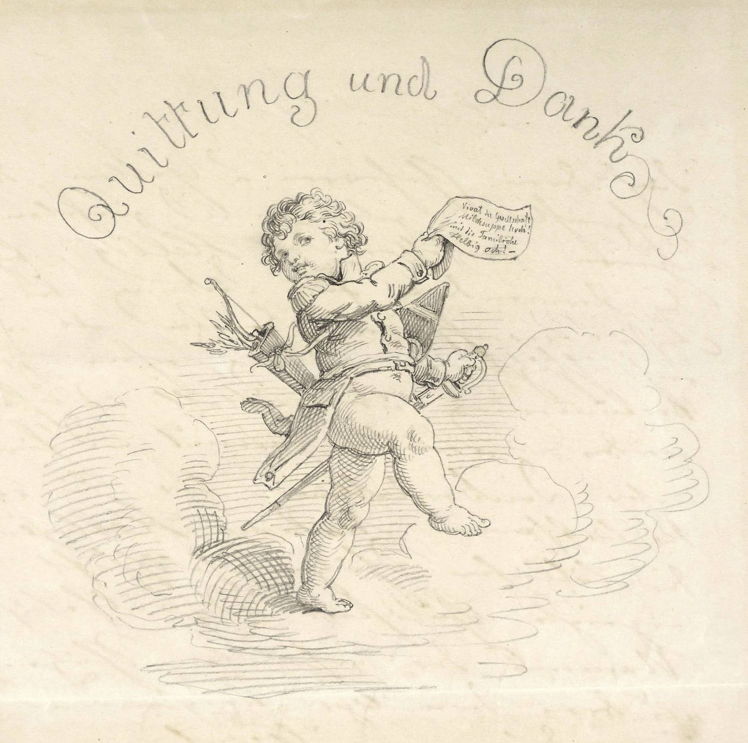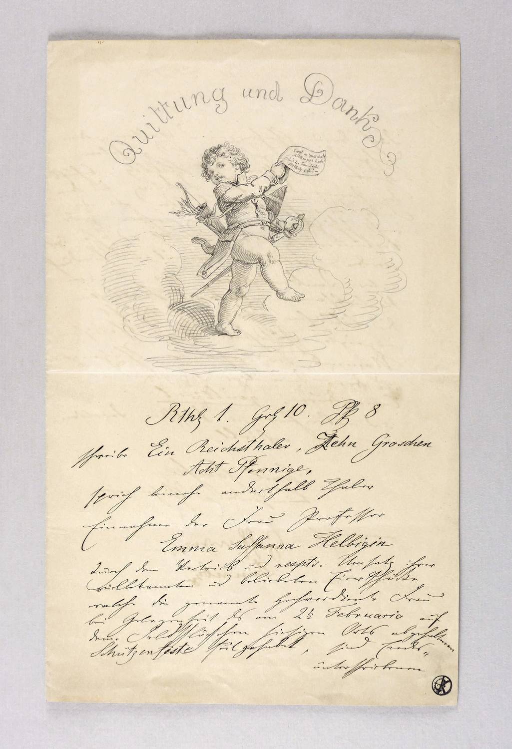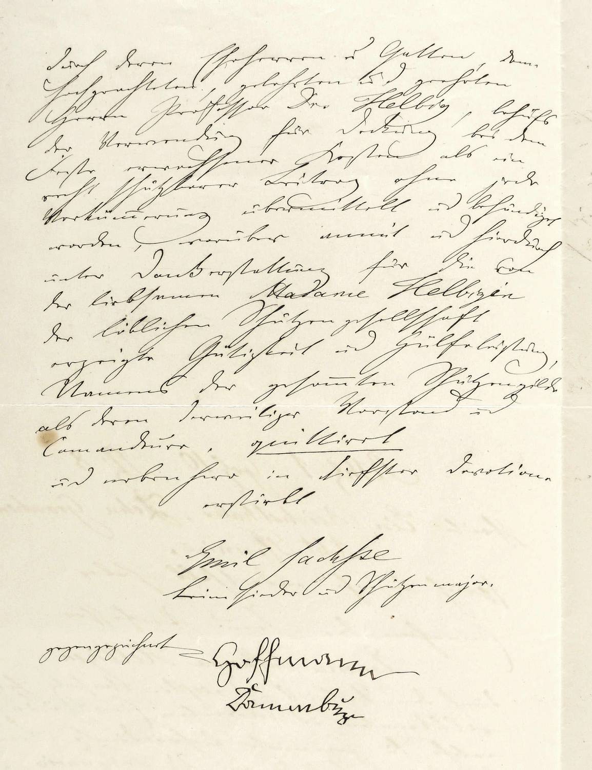 Darunter und verso in schwarzer Feder bezüglich der Eierschecke, die Frau Emma Susanna Helbig, Gattin des Prof. Dr. Helbig, zum Schützenfest am Feldschlösschen beitrug. – Blatt mit drei originalen horizontalen Faltungen. Guter Zustand.