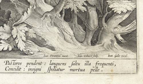 Aus: Stradanus (Jan van der Straet), Venationes Ferarum, Auium, Piscium. Pugnae bestiariorum: & mutuae bestiarum (Antwerpen: Jan Galle [1630]). – Rechts unten signiert: ″Ioan. Stradannus invent. Ioan. Collaert sculp.″ Unterhalb der Darstellung bezeichnet: ″Excrementa hominum panthera avido appetit ore : / Altius in vase haec quam ut saltu attingere possit, / Pastores pendunt : languens saltu illa frequenti, / Concidit : insigni spoliatur mortua pelle.″ – Blatt Nr. 15 der Folge. – Im linken Rand hinterlegter größerer Einriss. Obere linke Ecke leicht knickspurig. Sonst aber noch guter Zustand.