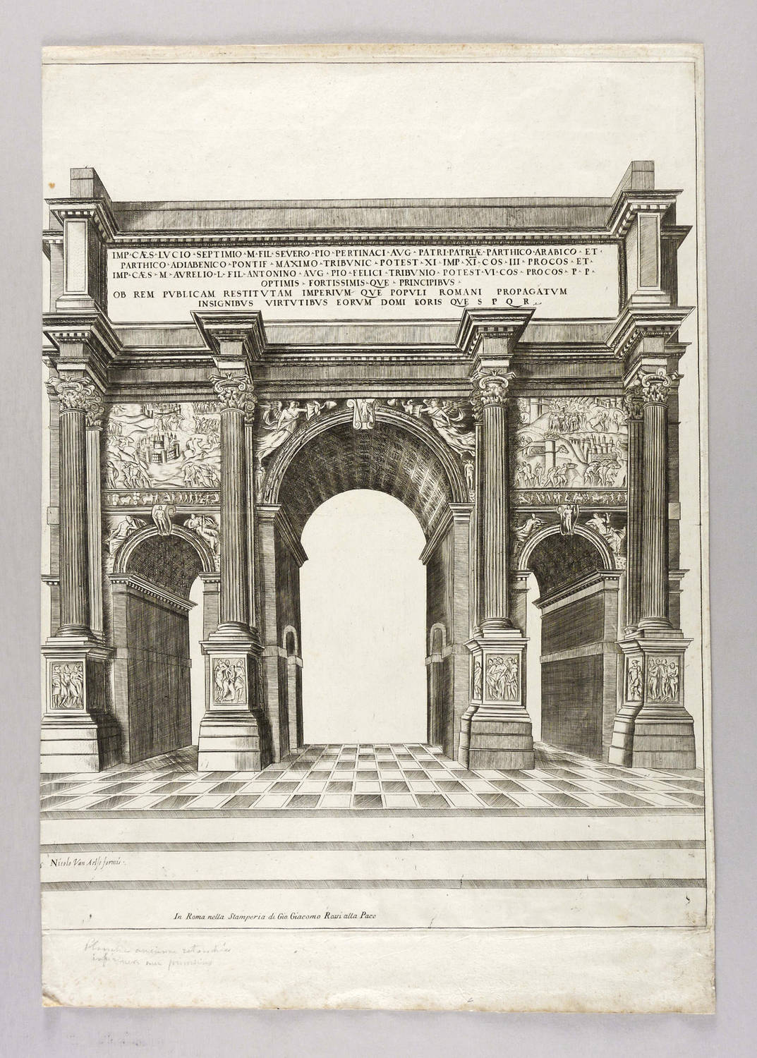 In der Platte links unten signiert: ″Rome Nicolo van Aelst formis″. Darunter Verlegeradresse: ″In Roma nella stamperia di Gio. Giacomo Rossi alla Pace″. – Blatt links beschnitten, mit leichtem Verlust der Darstellung. Im unteren Rand leicht angeschmutzt und fleckig, teils leicht knickspurig. Insgesamt dem Alter entsprechend mäßig guter Zustand.
