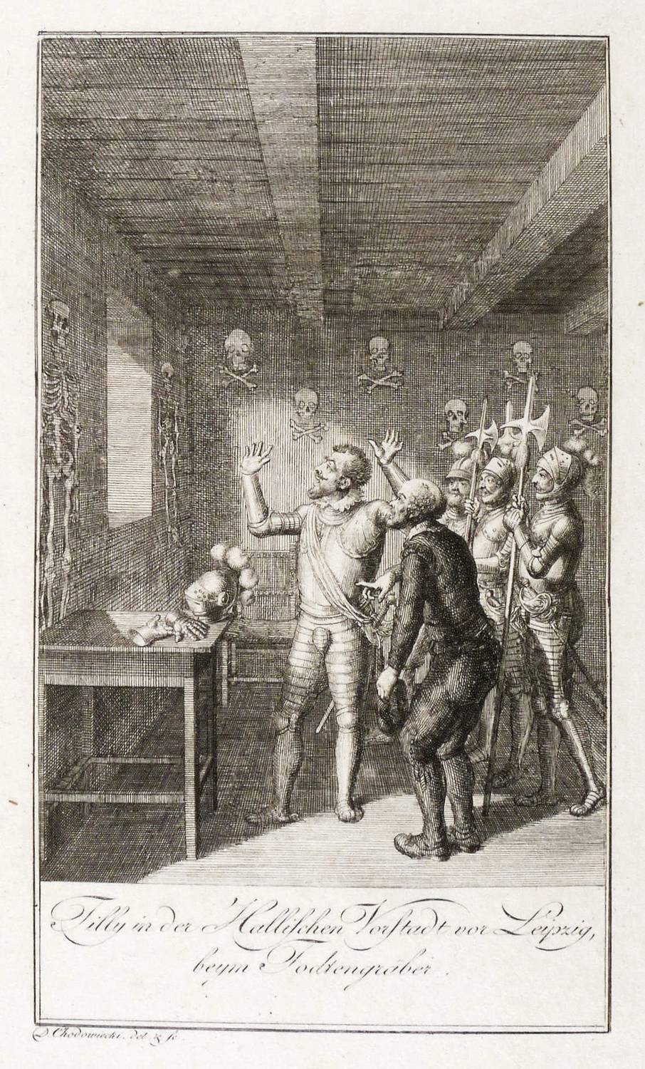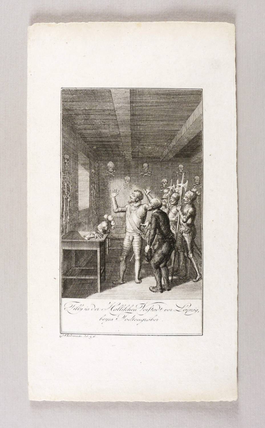 Daniel Nikolaus Chodowiecki (1726 Danzig - 1801 Berlin). Deutscher Kupferstecher, Grafiker und Illustrator. Bedeutender Vertreter der Kunst des Deutschen Klassizismus. Begann 1740 zunächst eine kaufmännische Lehre. Ab 1743 in der Haushaltswarenhandlung seines Onkels Antoine Ayrer in Berlin tätig. Letzterer unterstützte seine und seines Bruders Gottfried künstlerische Ausbildung und ließ beide von Johann Jakob Haid, Bernhard Rode und Johann Heinrich Meil unterrichten. Von den Ladengeschäften befreit, konnten sie sich 1754 mit Miniaturen und Emailmalereien selbstständig machen. Seit 1758 erste Radierversuche in allerlei Techniken wie Strichätzung, Aquatinta und Crayon-Manier. Frühe Verbindungen zu Verlegern von Almanachen und Kalendern beförderten diese Entwicklung. Vielbeschäftigt hat er Berlin nur selten verlassen. Eine längere Reise zu seiner Mutter nach Danzig im Jahre 1773 schlug sich dann entsprechend intensiv in seiner Arbeit nieder. Seit 1764 Mitglied der Königlich-Preußischen Akademie der Künste, ab 1797 deren Direktor.