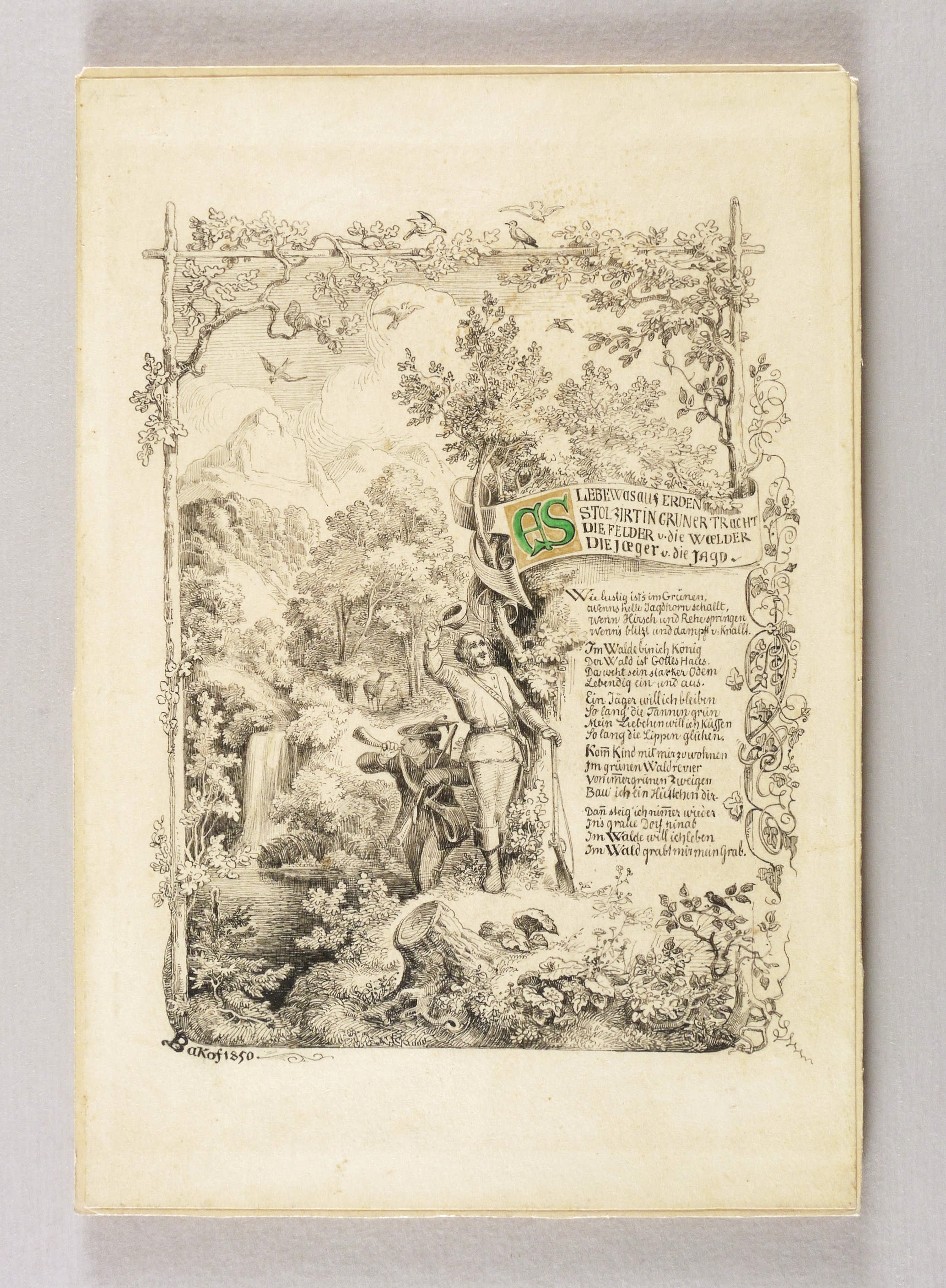 1850. Zeichnung / Federzeichnung, in schwarzer Tusche, die Initiale koloriert, auf Velin. – Originale Künstlergrafik, von Julius Bakof. – Unikat. – 25,5 x 17,5 cm (Blatt), 19,7 x 15,4 cm (Darstellung), 21 x 25 cm (Trägerblatt).