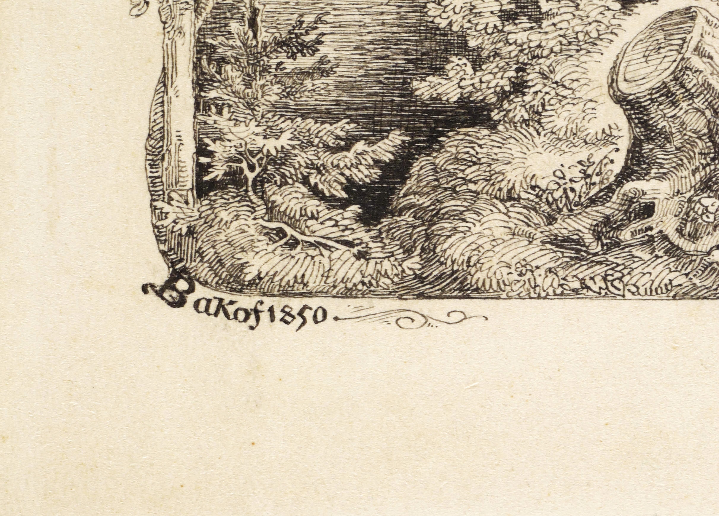 Rechts unten in schwarzer Feder signiert und datiert: ″Bakof 1850″. – Illustration zu einem Gedicht von Wilhelm Müller. – Blatt auf Trägerkarton aufgezogen. Ober rechte Ecke bestoßen. Sonst aber guter Zustand.