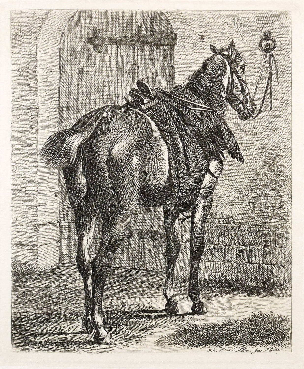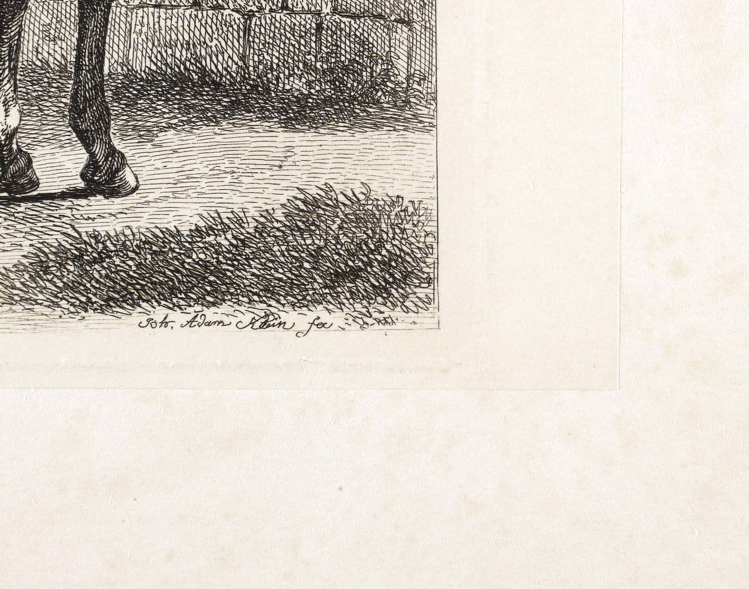 Johann Adam Klein (1792 Nürnberg - 1875 München). Deutscher Maler und Radierkünstler des Biedermeier. Erster Zeichenunterricht mit 8 Jahren bei dem Maler Georg Christoph von Bemmel. Ab 1805 Lehrling im Atelier des Kupferstechers Ambrosius Gabler. 1811 Schüler der von Gustav Philipp Zwinger geleiteten Nürnberger Zeichenschule. 1811-18 Studium an der Kunstakademie in Wien. Während einer Reise an Rhein und Main 1815 Begegnung mit dem Werk des Malers Wilhelm von Kobell. 1818 Reise ins Salzkammergut mit Johann Christoph Erhard, den Brüdern Friedrich Philipp und Heinrich Reinhold und Ernst Welker. 1819/20 Italienaufenthalt. 1839 Umsiedelung nach München und Heirat der Tochter des Kupferstechers Wolf. Mit seinen zahlreichen Tierstücken zählt Klein zu den wichtigsten Radierkünstlern des frühen 19. Jahrhunderts.