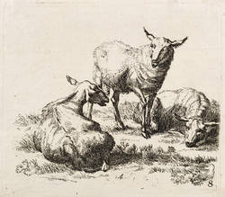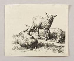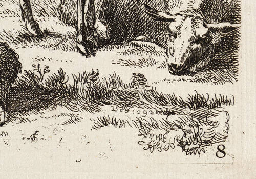 Im unteren Rand nicht lesbares Monogramm. Unten rechts datiert und darunter nummeriert: ″8″. – Seitenverkehrte Kopie nach Nicolaes Berchem, eines Blatt aus der Folge ″Animalia″. Auf der Rückseite des Blattes wird unrichtig auf Raphael Winter verwiesen. – Blatt verso mit Montageresten und Sammlungsstempel. Sonst guter Zustand.