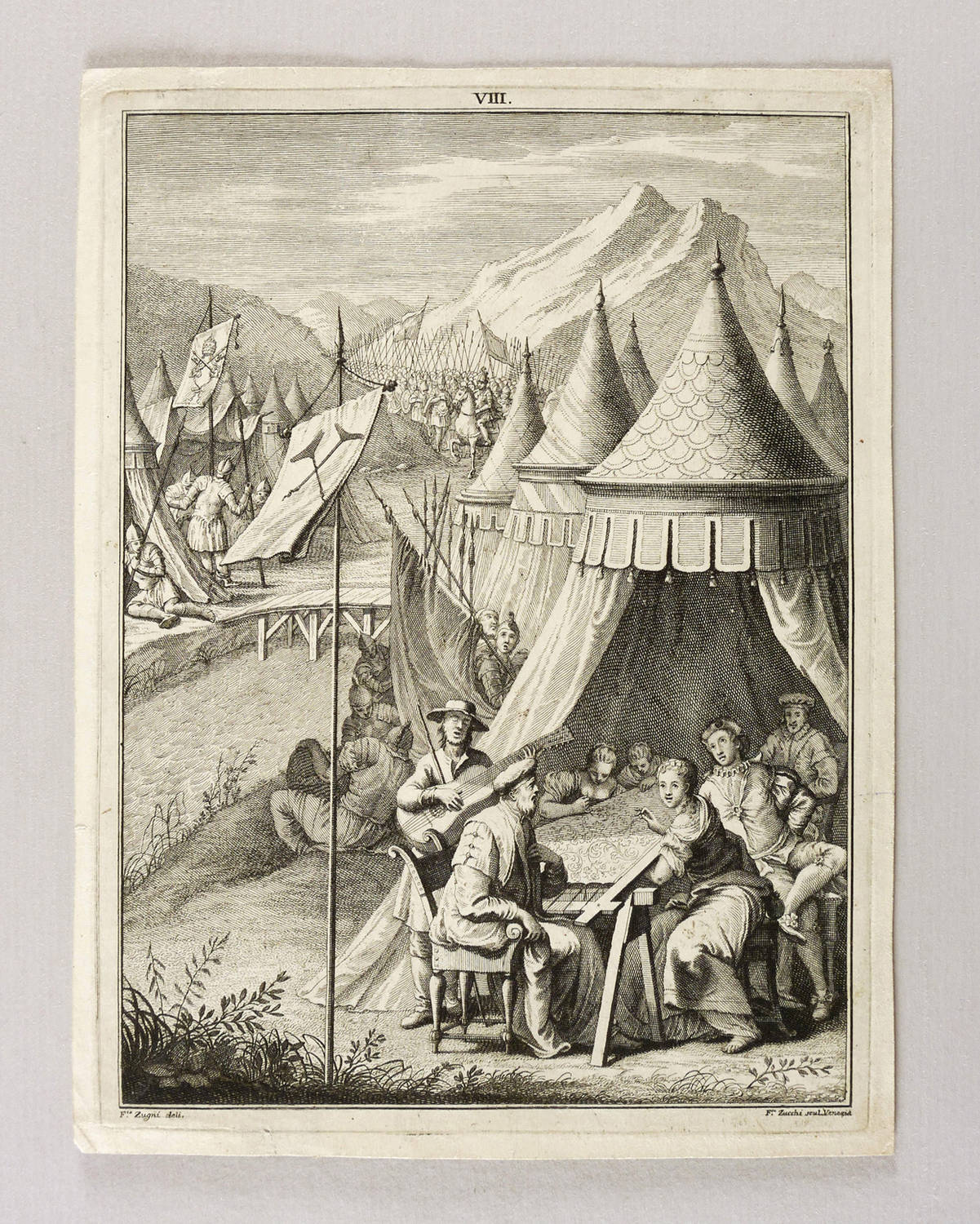 Aus: La Secchia Rapita (Modena: Soliani 1744). – Unten rechts signiert: ″F.co Zucci scul. Venezia″. Oberhalb der Darstellung nummeriert: ″VIII.″ – Blatt verso mit geringen Montageresten und Sammlungsstempel. Sonst guter Zustand.