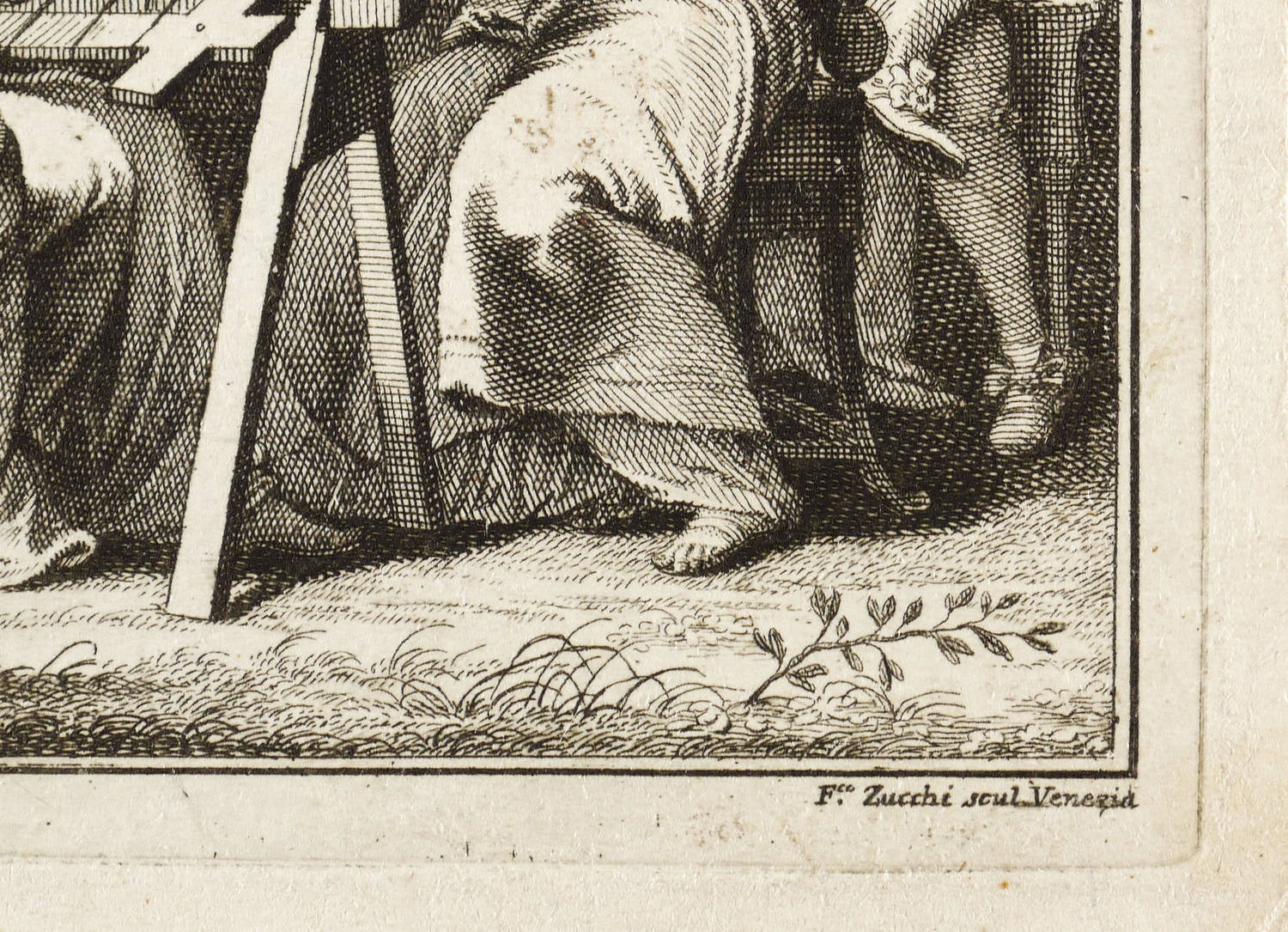 Francesco Zucchi d.J. (1692 Venedig - 1764 Venedig). Italienischer Kupferstecher, Bruder und Schüler von Andrea Zucchi. Wurde nach Dresden gerufen, um dort in der Königlichen Galerie nach Alten Meistern zu stechen, worin er durch den Siebenjährigen Krieg unterbrochen wurde. Er stellte diese Arbeiten in Venedig fertig. Neben Gemäldereproduktionen schuf er zahlreichen Veduten v.a. von Venedig, Brescia und Brixen.