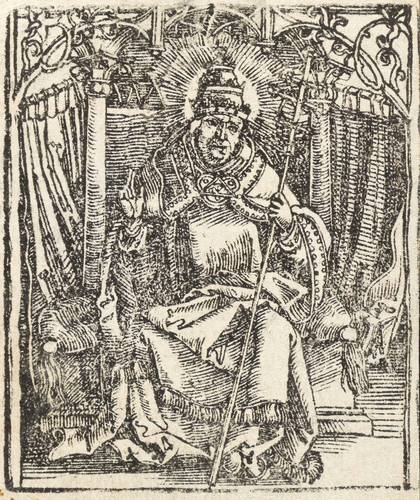 Verso typografischer lateinischer Rückentext. – Aus einer lateinischen Hymnen-Edition (ca. 1515-1530), die der Künstler mit Heiligenbildern ausstattete. Einige dieser Holzschnitte mit ligiertem Monogramm SE. – Mit schmalem Rändchen um die Einfassung. Papier oberflächlich geringfügig berieben. Leichte Montagespuren. Insgesamt gut erhalten.