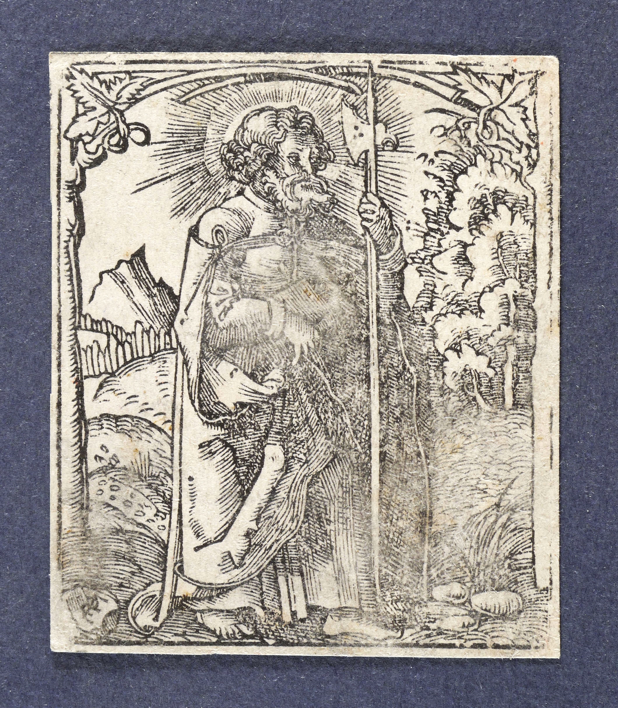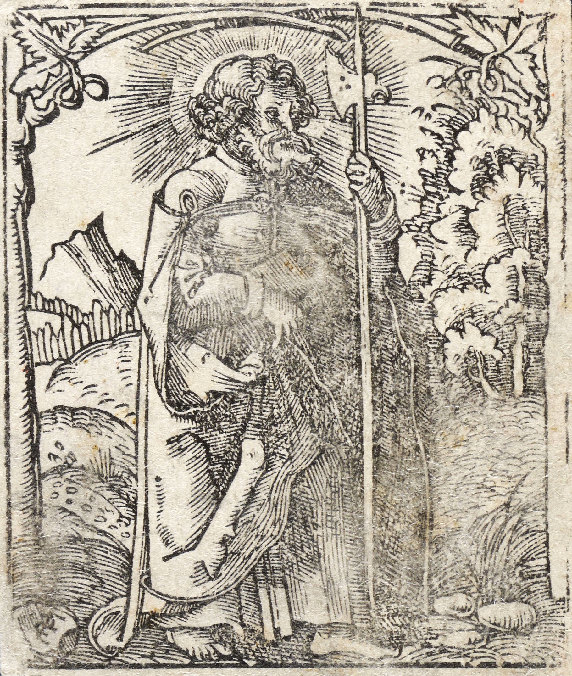 Im Druckstock links unten ligiertes Monogramm: ″SE″. Verso typografischer lateinischer Rückentext. – Aus einer lateinischen Hymnen-Edition (ca. 1515-1530), die der Künstler mit Heiligenbildern ausstattete. Einige dieser Holzschnitte mit ligiertem Monogramm SE. – Mit schmalem Rändchen um die Einfassung. Papier oberflächlich geringfügig berieben. Verso leichte Montagespuren. Insgesamt gut erhalten.