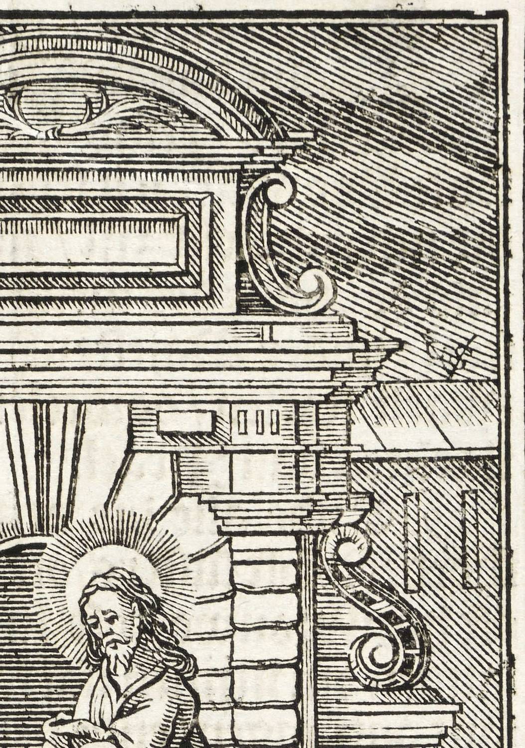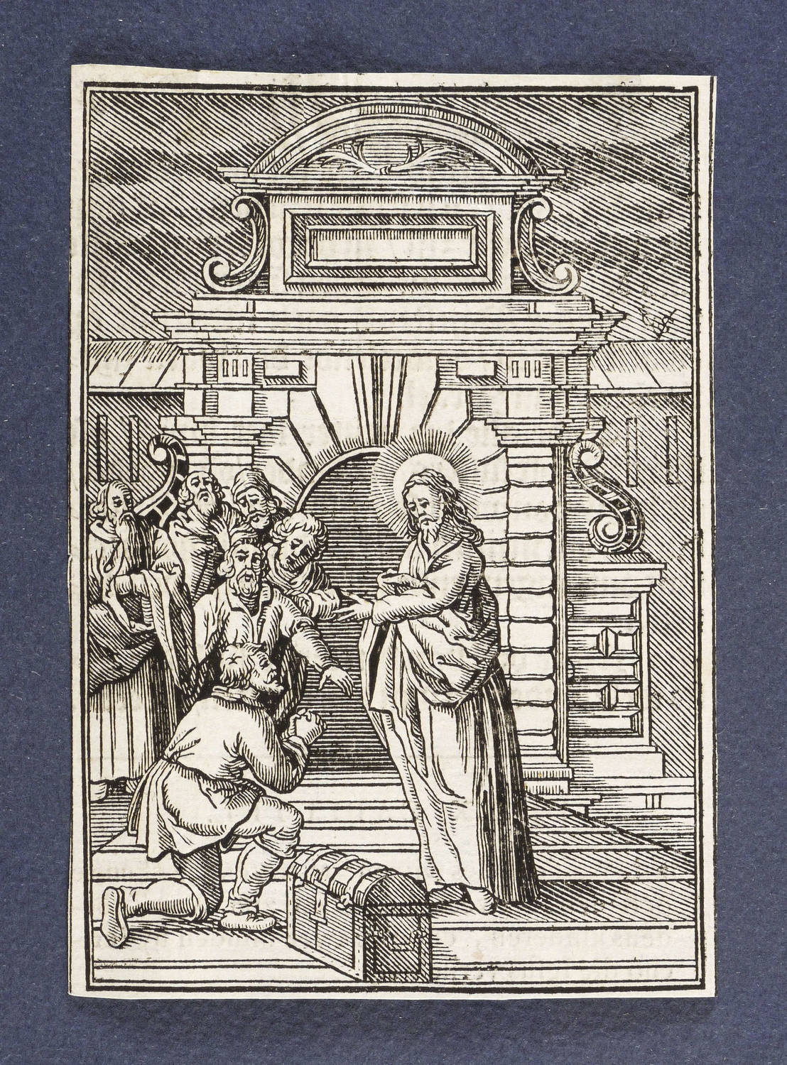 Aus: Het Nieuwe Testament ons Selichmaeckers Jesu Christi (Antwerpen: Cornelis Verschuren 1646). – Im Druckstock rechts oben in der Rückwand signiert mit ligiertem Monogramm CVS. Verso altniederländischer Rückentext. Daselbst Sammlerstempel EK im Kreis. – Schmales Rändchen um die Einfassung der Darstellung. Verso leichte Montagespuren. Papier stärker gewellt. Mäßig guter Zustand.