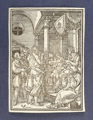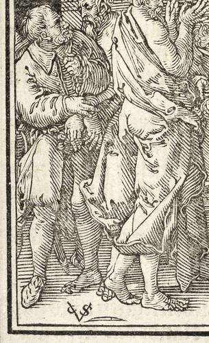 Aus: Het Nieuwe Testament ons Selichmaeckers Jesu Christi (Antwerpen: Cornelis Verschuren 1646). – Im Druckstock links unten signiert mit ligiertem Monogramm CVS und Schneidmesser. Verso altniederländischer typografischer Rückentext. Sammlerstempel EK im Kreis. – Mit schmalem Rändchen um die Darstellung. Verso leichte Montagespuren. Sehr guter Zustand.