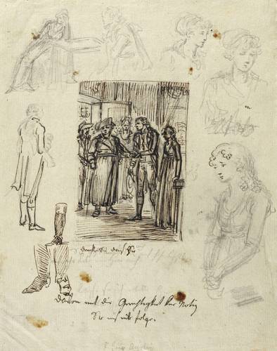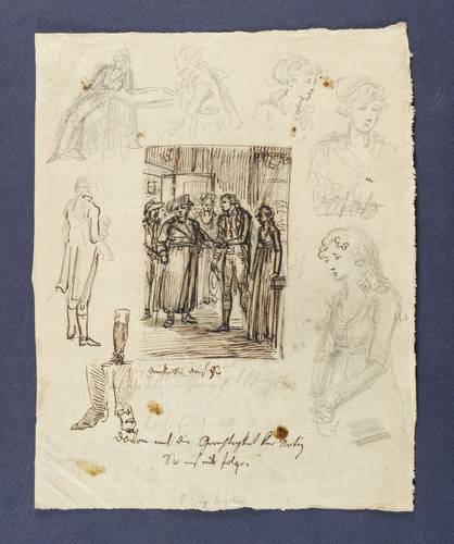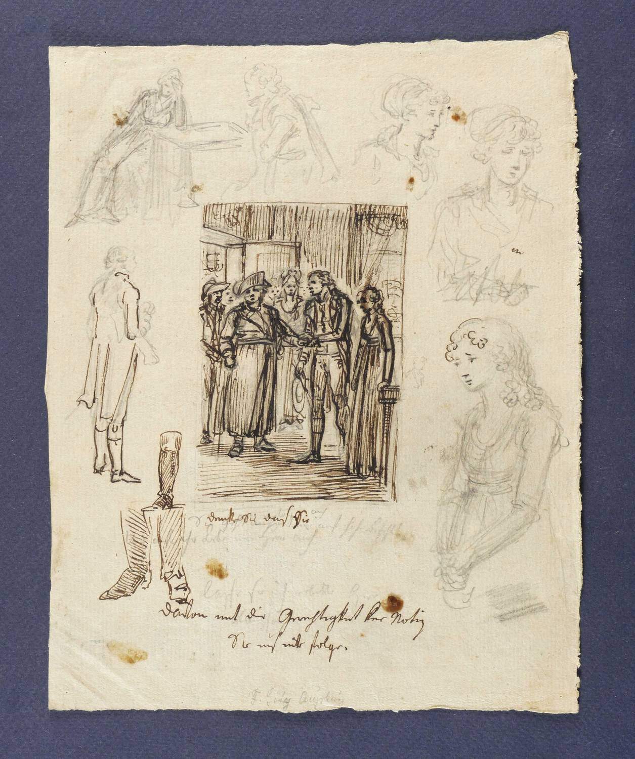 Am unteren Blattrand in Bleistift bezeichnet: ″F. Götz Augsburg″. Diverse unleserliche Bezeichnungen und Inschriften in Bleistift und Tusche. Verso drei Sammlerstempel. – Zentral eine Gesellschaftsszene, in der ein junger Mann um die Hand des neben ihm stehenden Fräuleins anhält. Zahlreiche Randskizzen mit Charakter- und Haltungssstudien etc. Verso einige Aquarellproben. – Im Rand diverse ältere Fleckchen, doch frischer Gesamteindruck. Verso diverse leichte Montagespuren. Guter bis sehr guter Erhaltungszustand.