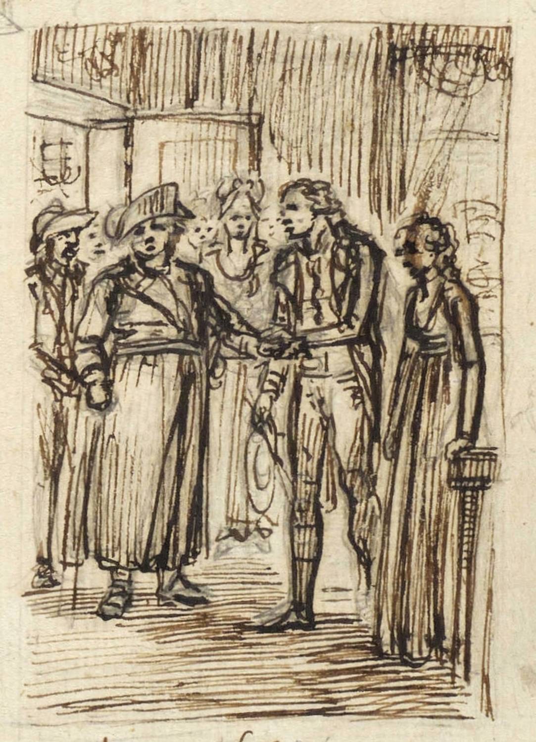 1780-1785. Zeichnung / Federzeichnung, in brauner Tusche, über Bleistift, auf Büttenpapier. – Originale Künstlergrafik, von Joseph Franz Freiherr von Goez. – Unikat. – 10,4 x 7,0 cm (Darstellung / Einfassungslinie), 23 x 18,5 cm (Blatt).