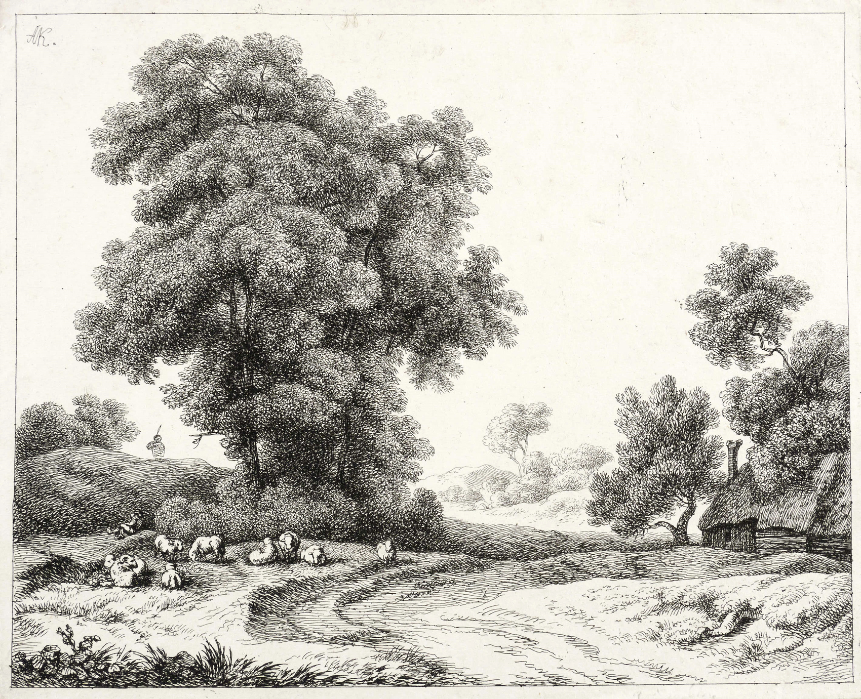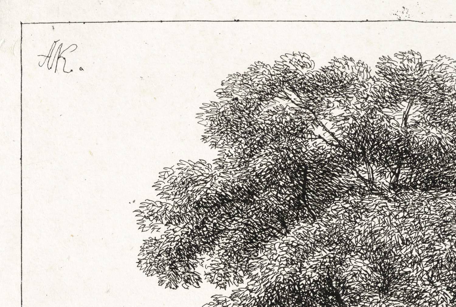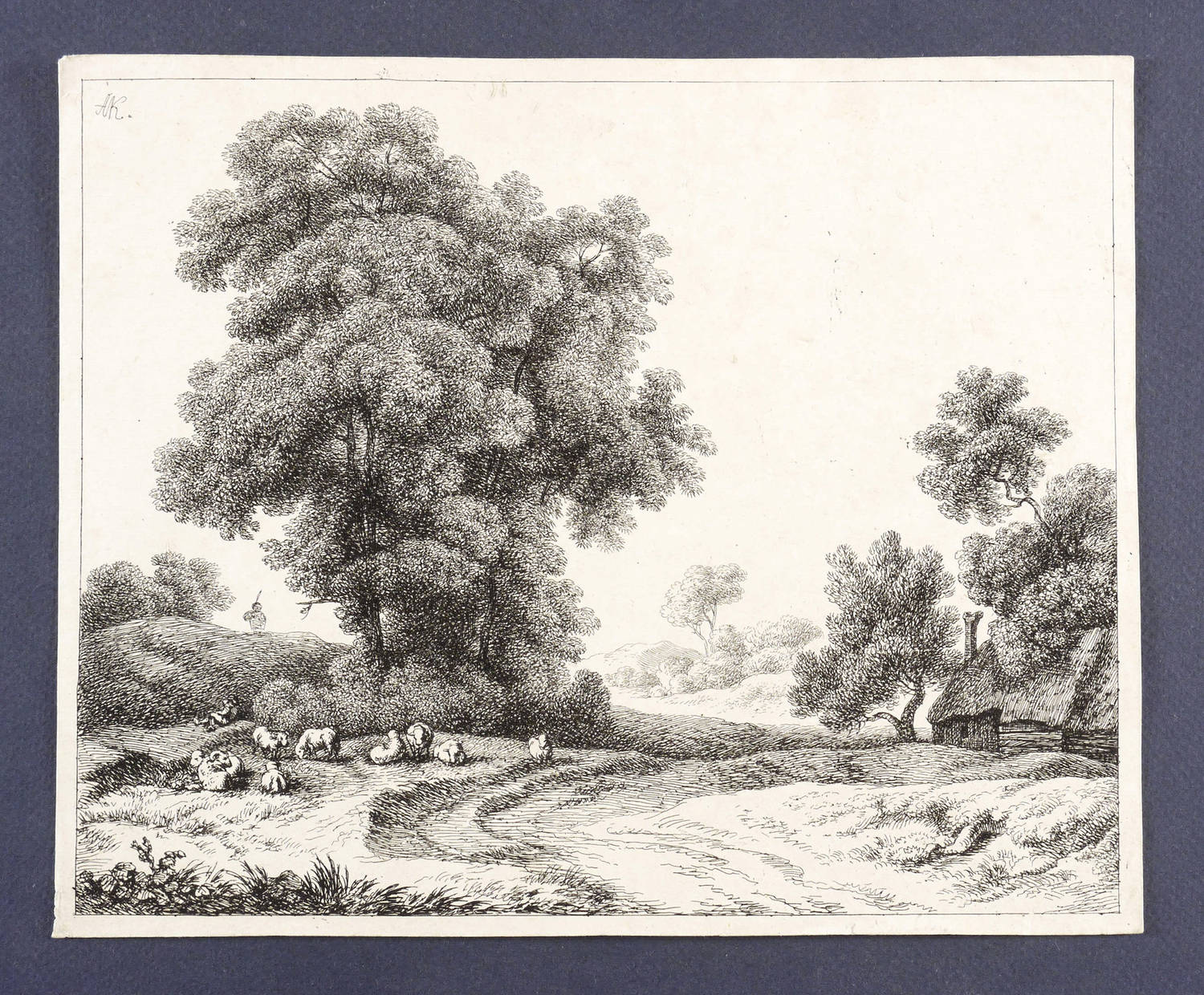 In der Platte links oben ligiertes Monogramm: ″AK.″ – Auf die Plattenkante beschnitten, schmales Rändchen um die Darstellung. Oberflächlich leicht angeschmutzt. Winzige Druckstelle im Himmel rechts oben. Verso leichte Montagespuren. Mäßig guter Zustand.