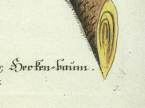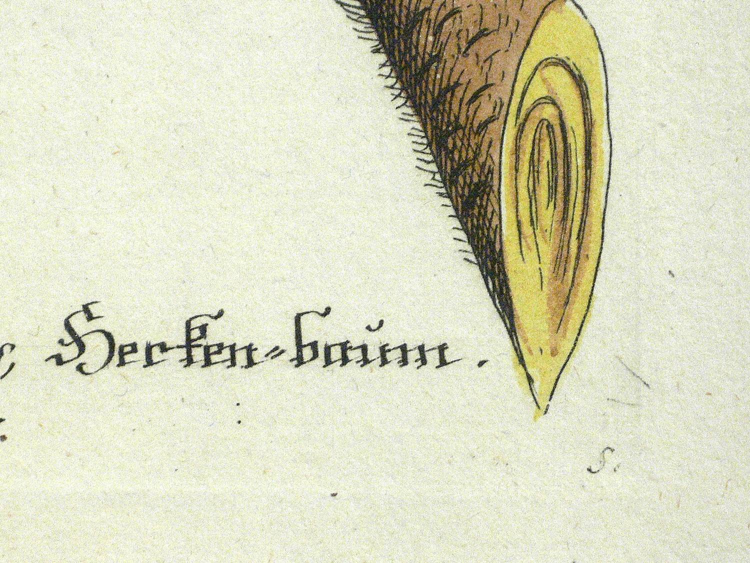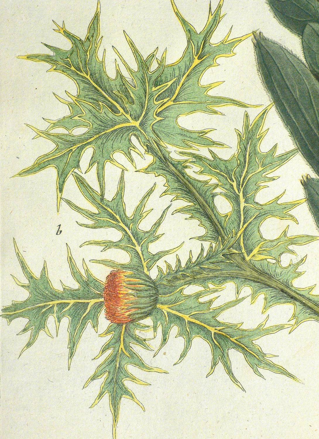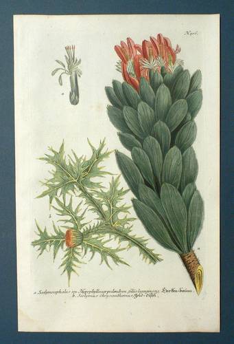 Aus: Johann Wilhelm Weinmann, Phytanthoza-Iconographia Oder Eigentliche Vorstellung Etlicher Tausend, So wohl Einheimisch- als Ausländischer, aus allen vier Welt-Theilen, in Verlauf vieler Jahre (...) gesammelter Pflantzen, Bäume, Stauden, Kräuter, Blumen, Früchten und Schwämme (Regensburg: Hieronymus Lentz 1737-1745), Bd. 3 (1742). – In der Platte rechts unten Signatur, rechts oben Tafel-Nr. "906", unten mittig ausführliche Inschrift: "a. Scolymocephalus seu Hypophyllocarpodendron foliis lanuginosis, Herken-baum. b. Scolymus chrysanthemus, Gold-distel." – Bei der unter a. vorgestellten Pflanze handelt es sich wohl um Mimetes cucullatus (Silberbaumgewächs). - Bei der Herstellung der Tafeln arbeiteten die Augsburger Künstler Bartholomäus Seutter, Johann Jakob Haid und Johann Elias Ridinger zusammen. Die Kupfer wurden in einer für die Zeit revolutionären Weise farbig gedruckt und sodann partiell von Hand koloriert. Dabei fand der von Seutter weiterentwickelte Mezzotinto-Farbdruck des Niederländers Johannes Teyler Anwendung. – Das kräftige Büttenpapier unten links marginal fleckig. Kontrastreiches, wohlerhaltenes Kolorit. Insgesamt guter Erhaltungszustand.