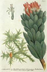 Silberbaumgewächse (Proteen). – Rote Pagoda (Mimetes cucullatus) & Golddistel. – Weinmann. – „Herken-baum. Gold-distel”.