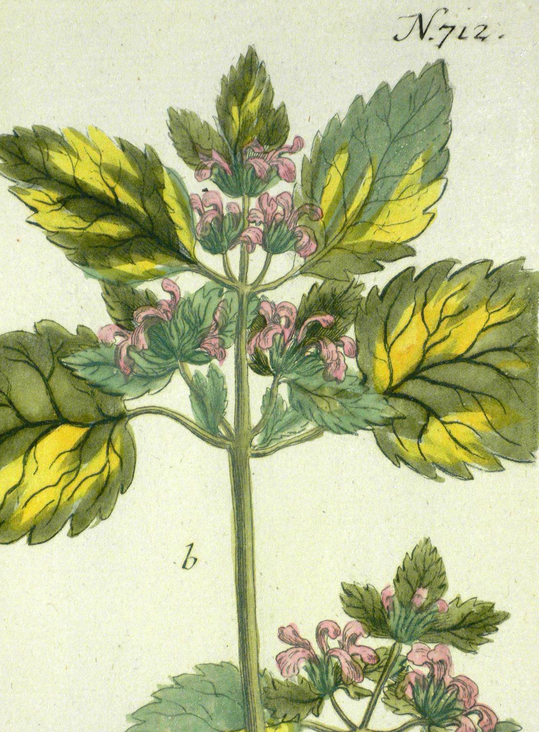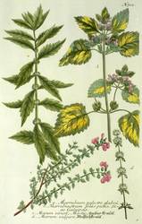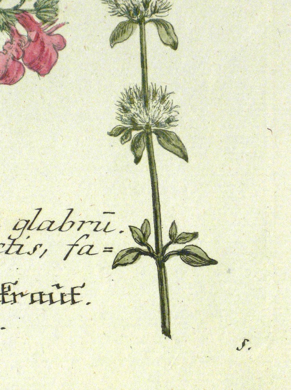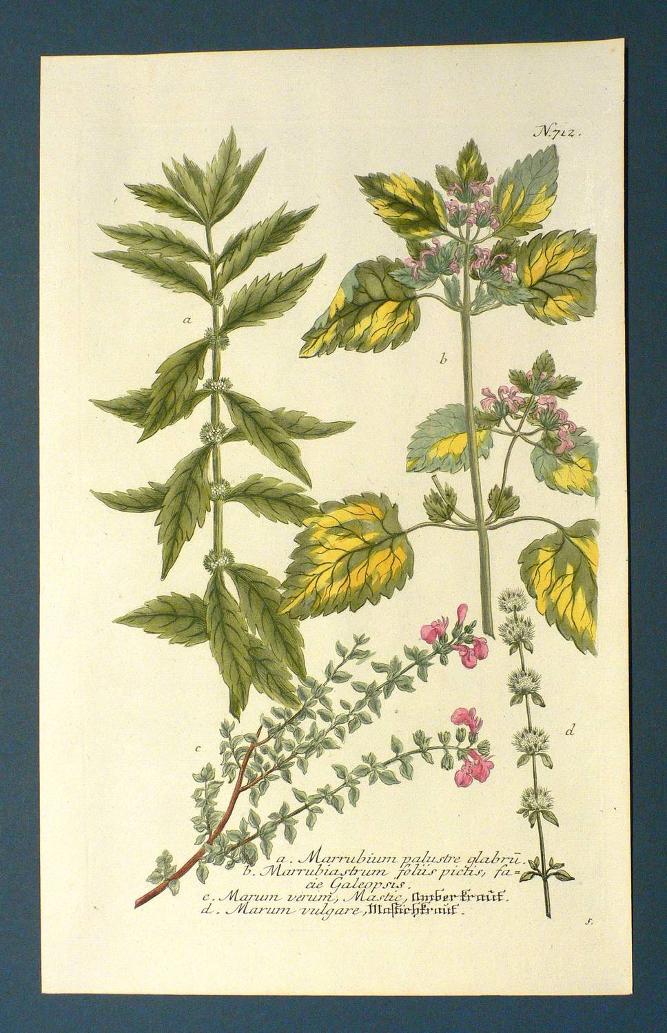 Aus: Johann Wilhelm Weinmann, Phytanthoza-Iconographia Oder Eigentliche Vorstellung Etlicher Tausend, So wohl Einheimisch- als Ausländischer, aus allen vier Welt-Theilen, in Verlauf vieler Jahre (...) gesammelter Pflantzen, Bäume, Stauden, Kräuter, Blumen, Früchten und Schwämme (Regensburg: Hieronymus Lentz 1737-1745), Bd. 2 (1739). – In der Platte rechts unten Signatur, rechts oben Tafel-Nr. "712", unten mittig ausführliche Inschrift: "a. Marrubium palustre glabru[m]. b. Marrubiastrum foliis pictis, facie Galeopsis. c. Marum verum, Mastic, amber-kraut. d. Marum vulgare, Mastichkraut." – Bei der Pflanze unter b. handelt es sich wohl um einen Hohlzahn (Galeopsis). Während c. und d. zu Teucrium (Gamander) zu rechnen sind. - Bei der Herstellung der Tafeln arbeiteten die Augsburger Künstler Bartholomäus Seutter, Johann Jakob Haid und Johann Elias Ridinger zusammen. Die Kupfer wurden in einer für die Zeit revolutionären Weise farbig gedruckt und sodann partiell von Hand koloriert. Dabei fand der von Seutter weiterentwickelte Mezzotinto-Farbdruck des Niederländers Johannes Teyler Anwendung. – Das kräftige Büttenpapier sauber und frisch. Kontrastreiches wohlerhaltenes Kolorit. Insgesamt sehr guter Erhaltungszustand.