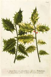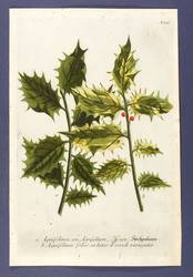 Aus: Johann Wilhelm Weinmann, Phytanthoza-Iconographia Oder Eigentliche Vorstellung Etlicher Tausend, So wohl Einheimisch- als Ausländischer, aus allen vier Welt-Theilen, in Verlauf vieler Jahre (...) gesammelter Pflantzen, Bäume, Stauden, Kräuter, Blumen, Früchten und Schwämme (Regensburg: Hieronymus Lentz 1737-1745), Bd. 3 (1742). – In der Platte rechts oben Tafel-Nr. "158". Unten mittig ausführliche Inschrift: "a. Aquifolium seu Agrifolium, Houx. Stechpalmen. B. Aquifolium foliis ex luteo et viridi variegatis." – Bei der Herstellung der Tafeln arbeiteten die Augsburger Künstler Bartholomäus Seutter, Johann Jakob Haid und Johann Elias Ridinger zusammen. Die Kupfer wurden in einer für die Zeit revolutionären Weise farbig gedruckt und sodann partiell von Hand koloriert. Dabei fand der von Seutter weiterentwickelte Mezzotinto-Farbdruck des Niederländers Johannes Teyler Anwendung. - Die dargestellte Stechpalme wird heute als Ilex aquifolium L. bezeichnet. – Im linken Rand Reste vormaliger Bindung. Partiell stockfleckig und leicht angeschmutzt. Insgesamt noch guter Erhaltungszustand.