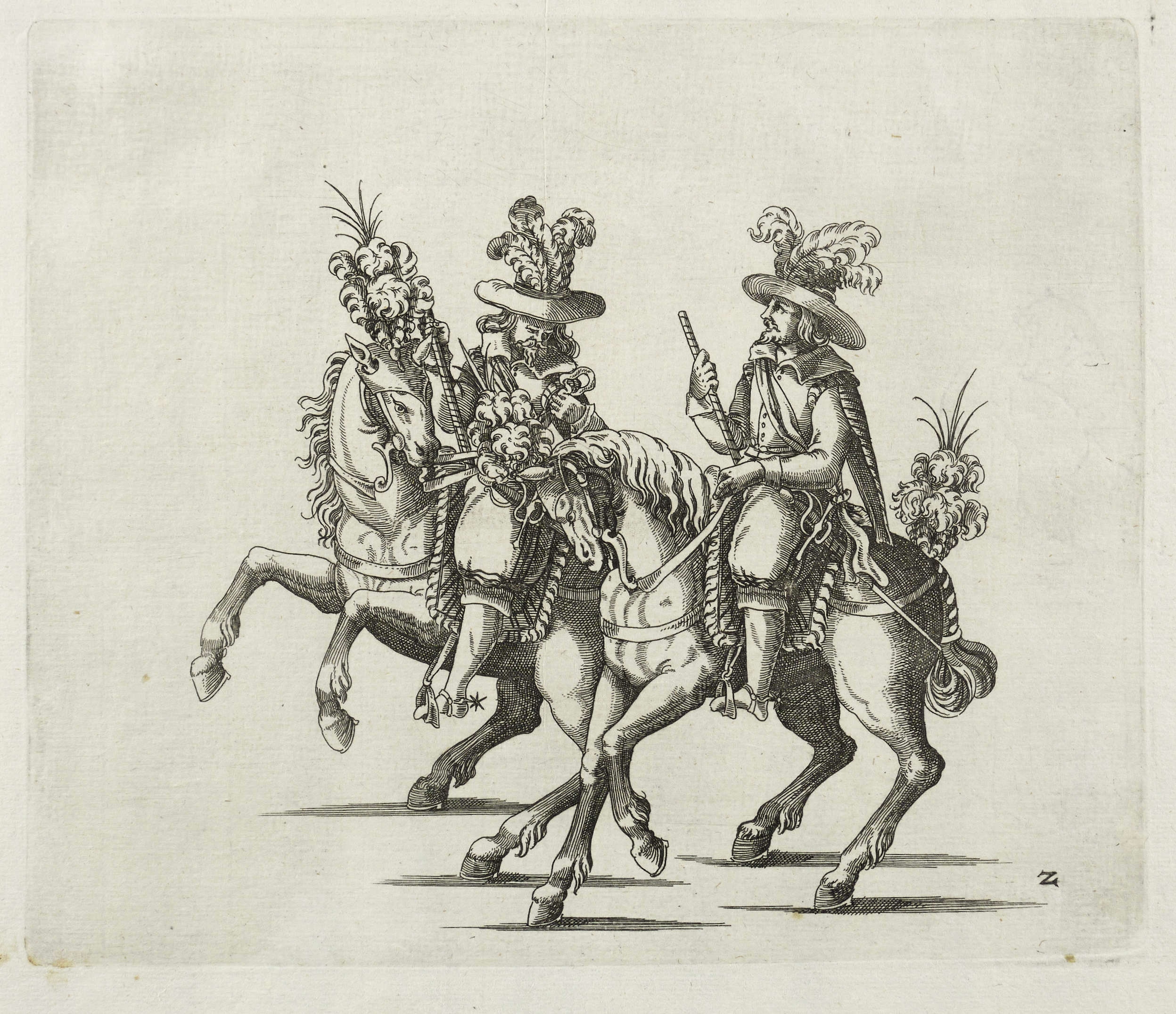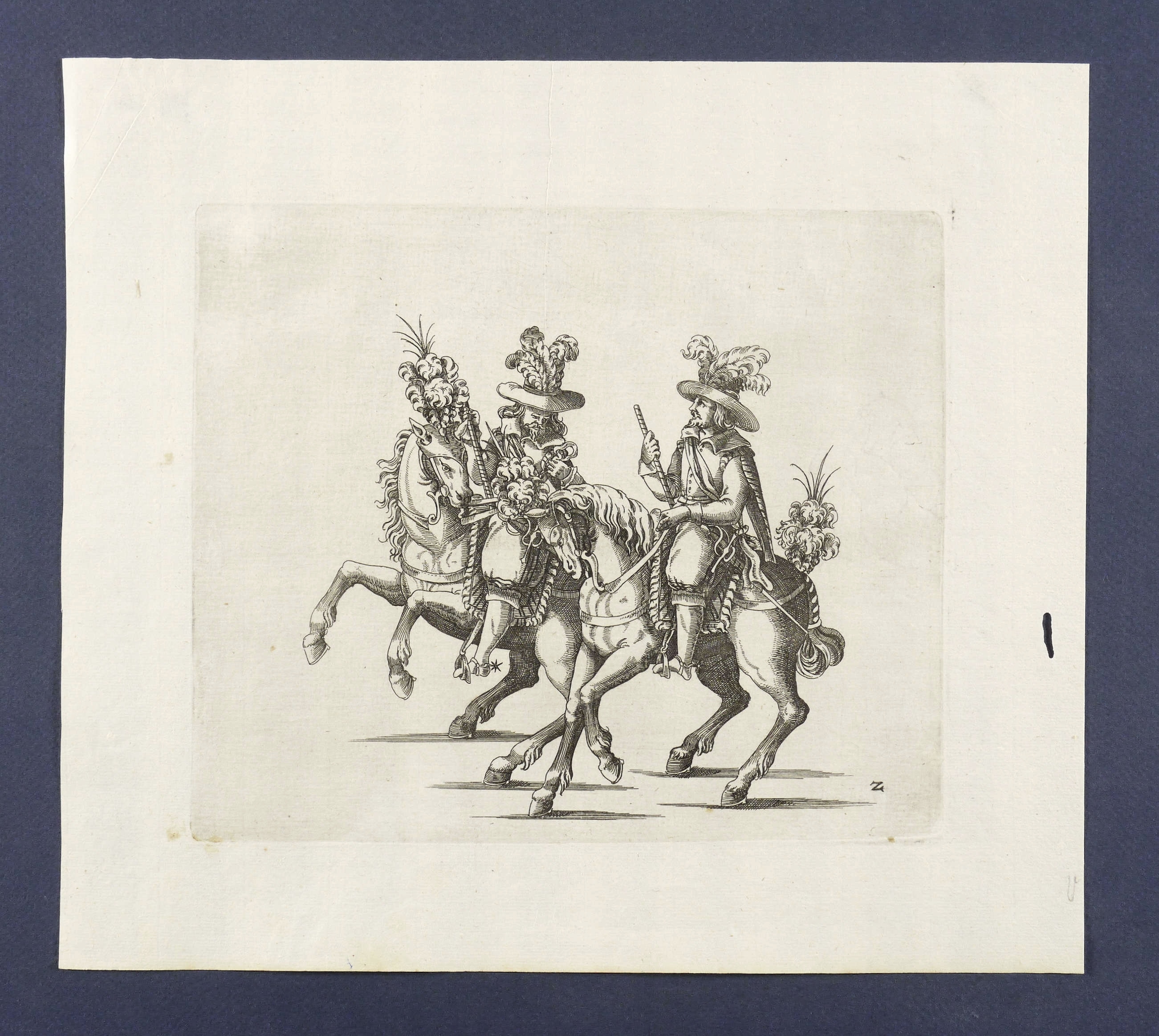 Aus: Balthasar Küchler, Repraesentatio der Fürstlichen Auffzug und Ritterspil. So bei des Durchleuchtigen Hochgebornen Fürsten und Herren Herrn Johann Friderichen Hertzogen zu Wurttenberg und Teckh ... und ... Frewlin Barbara Sophien geborne Marggravin zu Brande[n]burg [etc.] Hochzeitlich. Ehrnfest den 6. Novemb. Ao. 1609. In d (Schwäbisch Gmünd: Balthasar Küchler 1611). – In der Platte rechts unten Nummerierung: ″2″. – Blatt Nr. 2 der 18. Abteilung aus dem festlichen Aufzug zur Stuttgarter Hochzeit Herzog Johann Friedrichs von Württemberg mit Barbara Sophie, Markgräfin zu Brandenburg (5. bis 13. November 1609). – Blatt breitrandig. Der schmale Papierstreifen mit gedrucktem Titel original aufgeleimt. Im Rand rechts Wurmfraß. Insgesamt aber sehr guter Erhaltungszustand.