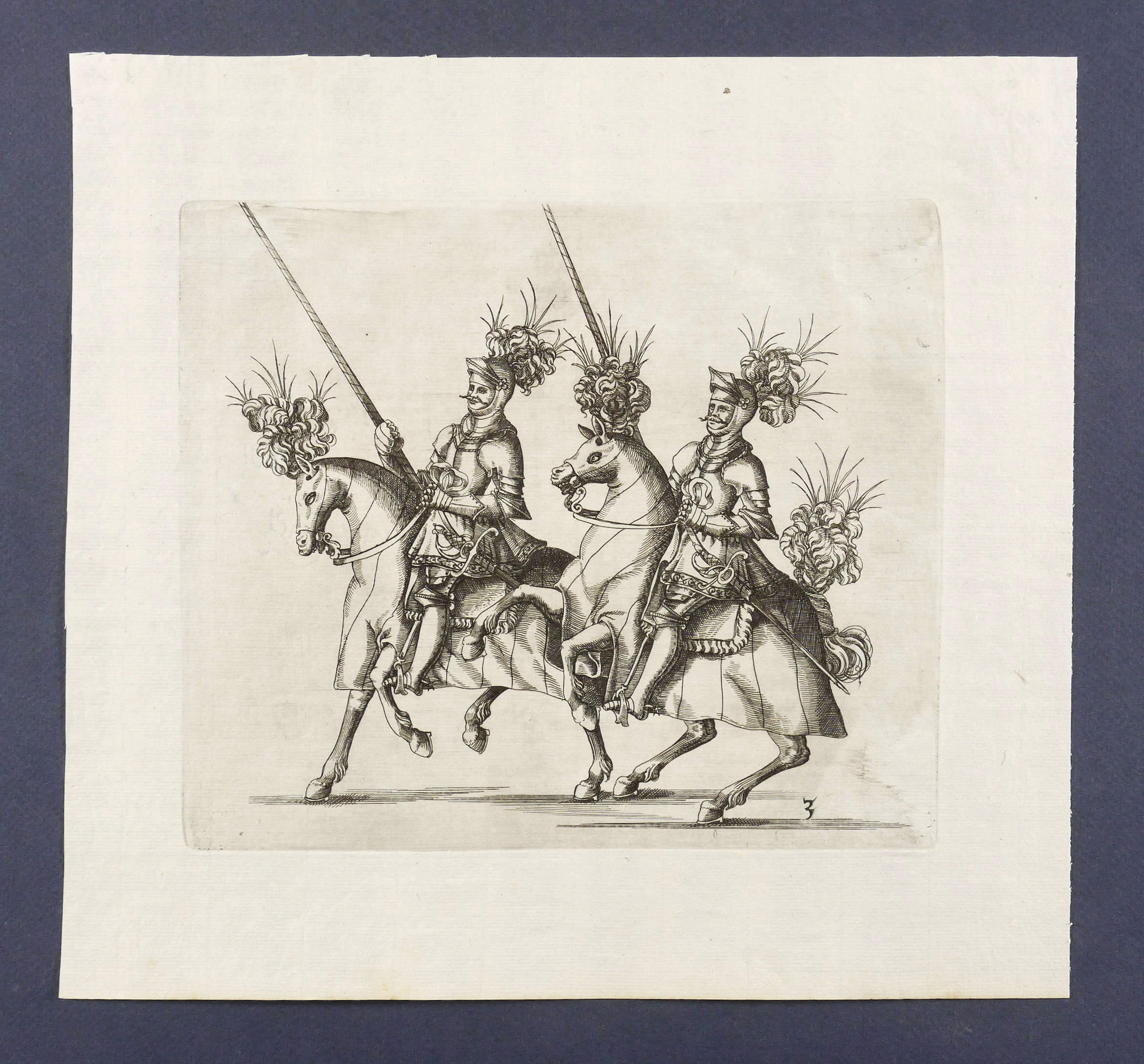 Aus: Balthasar Küchler, Repraesentatio der Fürstlichen Auffzug und Ritterspil. So bei des Durchleuchtigen Hochgebornen Fürsten und Herren Herrn Johann Friderichen Hertzogen zu Wurttenberg und Teckh ... und ... Frewlin Barbara Sophien geborne Marggravin zu Brande[n]burg [etc.] Hochzeitlich. Ehrnfest den 6. Novemb. Ao. 1609. In d (Schwäbisch Gmünd: Balthasar Küchler 1611). – In der Platte rechts unten Nummerierung: ″3″. – Blatt Nr. 3 der 18. Abteilung aus dem festlichen Aufzug zur Stuttgarter Hochzeit Herzog Johann Friedrichs von Württemberg mit Barbara Sophie, Markgräfin zu Brandenburg (5. bis 13. November 1609). – Breitrandiges Exemplar. Sehr guter Erhaltungszustand.