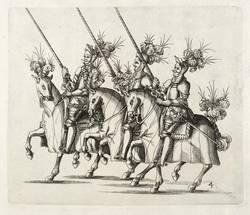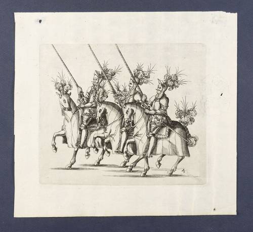 Aus: Balthasar Küchler, Repraesentatio der Fürstlichen Auffzug und Ritterspil. So bei des Durchleuchtigen Hochgebornen Fürsten und Herren Herrn Johann Friderichen Hertzogen zu Wurttenberg und Teckh ... und ... Frewlin Barbara Sophien geborne Marggravin zu Brande[n]burg [etc.] Hochzeitlich. Ehrnfest den 6. Novemb. Ao. 1609. In d (Schwäbisch Gmünd: Balthasar Küchler 1611). – In der Platte rechts unten Nummerierung: ″4″. – Blatt Nr. 4 der 18. Abteilung aus dem festlichen Aufzug zur Stuttgarter Hochzeit Herzog Johann Friedrichs von Württemberg mit Barbara Sophie, Markgräfin zu Brandenburg (5. bis 13. November 1609). – Breitrandiges Exemplar. Rand bisweilen geringfügig löchrig. Insgesamt aber doch sehr guter Erhaltungszustand.