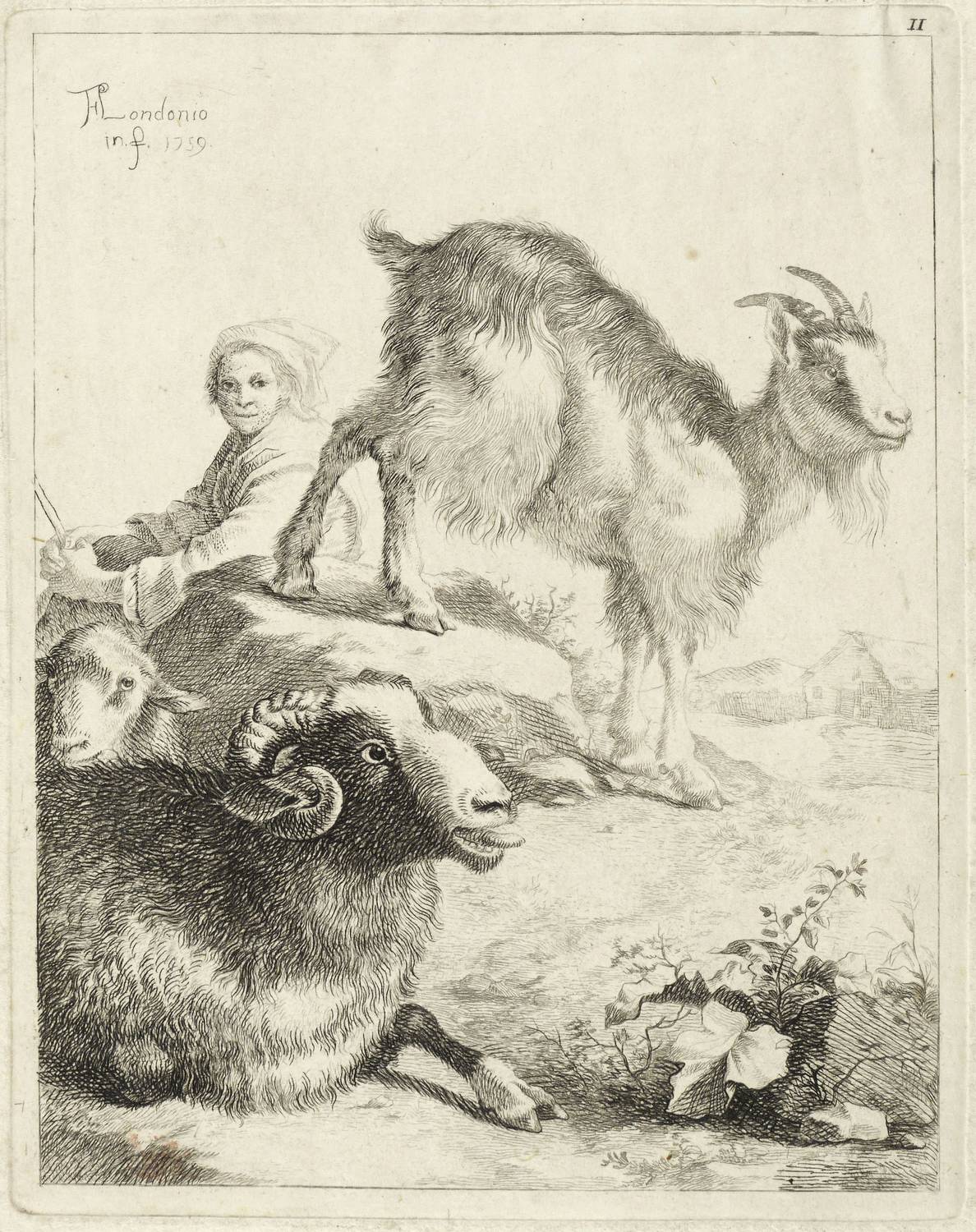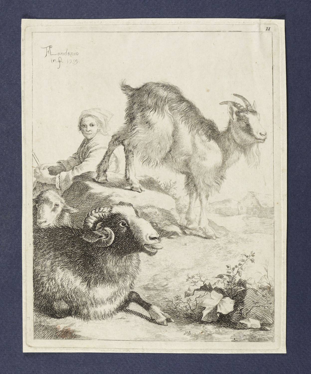 In der Platte links oben signiert und datiert: ″FLondonio M. f. 1759″. Rechts oben nummeriert: ″11″. – Aus einer Radier-Folge ″Pastoralen″ mit 17 Blättern, gewidmet Kardinal Pozzobonelli. – Schmaler Rand um die Platte. In der rechten oberen Ecke schwach ausgeprägte Quetschfalte. Insgesamt guter Zustand.