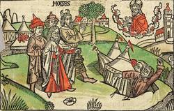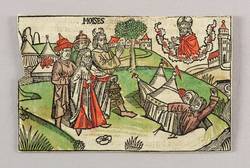 In der Darstellung geschnittene Inschrift: ″MOISES″. Verso Besitzstempel der Königlichen Kupferstich-Sammlung München (Lugt 1614). Dazu Veräußerungs-Stempel, handschriftlich datiert 6.3.1920. – Spätgotische Buchillustration aus der deutschen Bibel des Augsburger Drucker- Verlegers Johann Schönsperger d.Ä. (1455- 1521) in der Ausgabe von 1490. – Die Holzschnitte bei Schönsperger sind Kopien nach den llustrationen der im Format größeren Koberger-Bibel aus Nürnberg. – Mit knappem Rändchen um die Einfassungslinie des Holzschnitts. Linker Rand mit leichtem Papierverlust. Mäßig guter Zustand.