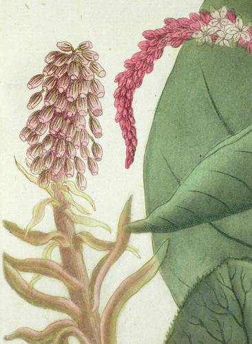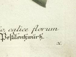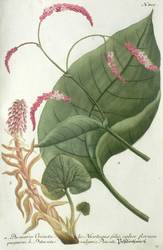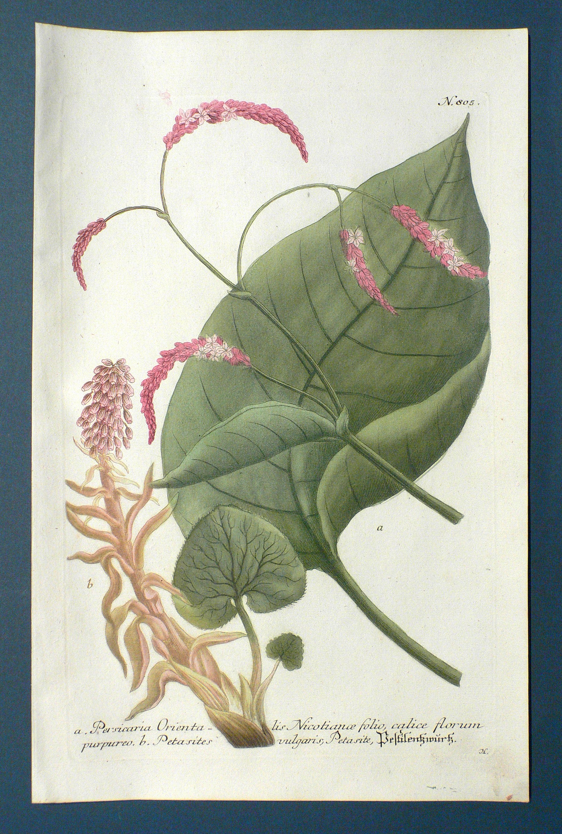 Aus: Johann Wilhelm Weinmann, Phytanthoza-Iconographia Oder Eigentliche Vorstellung Etlicher Tausend, So wohl Einheimisch- als Ausländischer, aus allen vier Welt-Theilen, in Verlauf vieler Jahre (...) gesammelter Pflantzen, Bäume, Stauden, Kräuter, Blumen, Früchten und Schwämme (Regensburg: Hieronymus Lentz 1737-1745), Bd. 3 (1742). – Rechts unten Signatur, rechts oben Tafel-Nr. "805", unten mittig ausführliche bezeichnet: "a. Persicaria Orientalis Nicotianae folio, calice florum purpureo. b. Petasites vulgaris, Petasite, Pestilentzwurtz." – Bei der Herstellung der Tafeln arbeiteten die Augsburger Künstler Bartholomäus Seutter, Johann Jakob Haid und Johann Elias Ridinger zusammen. Die Kupfer wurden in einer für die Zeit revolutionären Weise farbig gedruckt und sodann partiell von Hand koloriert. Dabei fand der von Seutter weiterentwickelte Mezzotinto-Farbdruck des Niederländers Johannes Teyler Anwendung. – Das kräftige Büttenpapier sauber und frisch. Wohlerhaltenes Kolorit. Guter Erhaltungszustand.