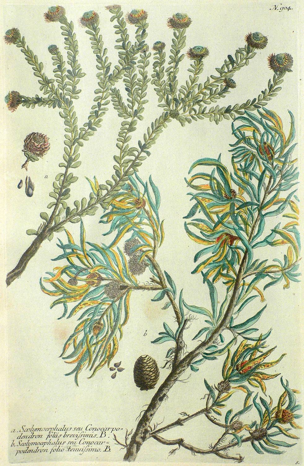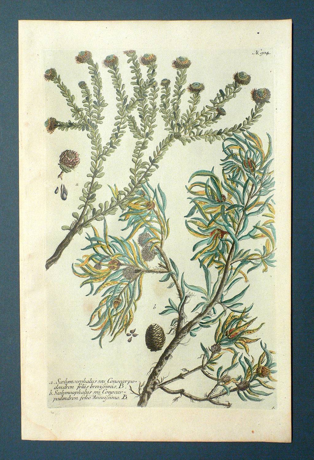 Aus: Johann Wilhelm Weinmann, Phytanthoza-Iconographia Oder Eigentliche Vorstellung Etlicher Tausend, So wohl Einheimisch- als Ausländischer, aus allen vier Welt-Theilen, in Verlauf vieler Jahre (...) gesammelter Pflantzen, Bäume, Stauden, Kräuter, Blumen, Früchten und Schwämme (Regensburg: Lentz 1745), Bd. IV. – Rechts unten Signatur, rechts oben Tafel-Nr. "904", unterhalb ausführliche Inschrift. – Bei der Herstellung der Tafeln arbeiteten die Augsburger Künstler Bartholomäus Seutter, Johann Jakob Haid und Johann Elias Ridinger zusammen. Die Kupfer wurden in einer für die Zeit revolutionären Weise farbig gedruckt und sodann partiell von Hand koloriert. Dabei fand der von Seutter weiterentwickelte Mezzotinto-Farbdruck des Niederländers Johannes Teyler Anwendung. – Das kräftige Büttenpapier bis auf einen schwachen Wasserfleck unten links, sauber und frisch. Kontrastreiches wohlerhaltenes Kolorit. Insgesamt guter Erhaltungszustand.