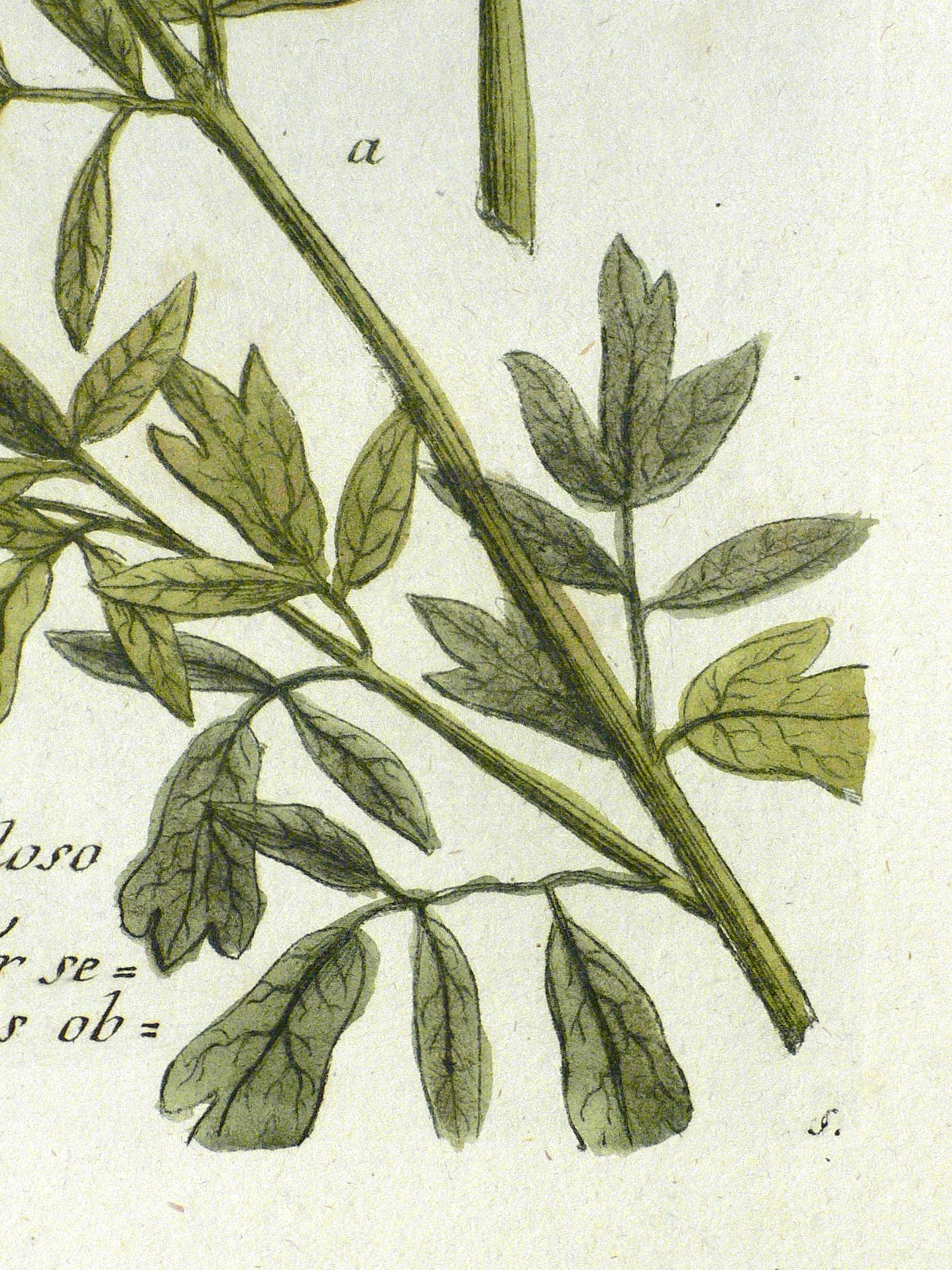 Aus: Johann Wilhelm Weinmann, Phytanthoza-Iconographia Oder Eigentliche Vorstellung Etlicher Tausend, So wohl Einheimisch- als Ausländischer, aus allen vier Welt-Theilen, in Verlauf vieler Jahre (...) gesammelter Pflantzen, Bäume, Stauden, Kräuter, Blumen, Früchten und Schwämme (Regensburg: Lentz 1745), Bd. IV. – Rechts unten Signatur, rechts oben Tafel-Nr. "971", unterhalb mittig ausführliche Inschrift. – Bei der Herstellung der Tafeln arbeiteten die Augsburger Künstler Bartholomäus Seutter, Johann Jakob Haid und Johann Elias Ridinger zusammen. Die Kupfer wurden in einer für die Zeit revolutionären Weise farbig gedruckt und sodann partiell von Hand koloriert. Dabei fand der von Seutter weiterentwickelte Mezzotinto-Farbdruck des Niederländers Johannes Teyler Anwendung. – Das kräftige Büttenpapier sauber und frisch. Guter Erhaltungszustand.