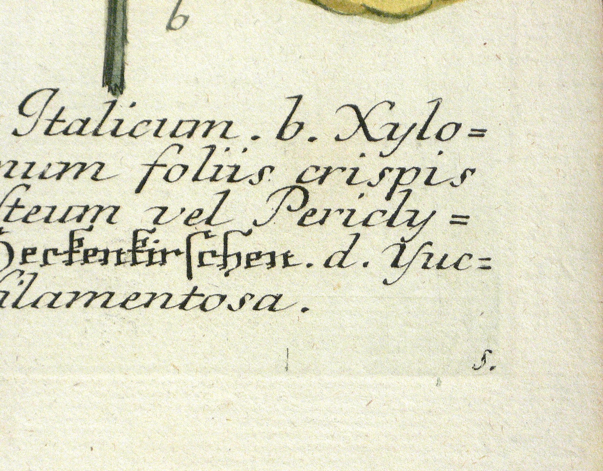 Aus: Johann Wilhelm Weinmann, Phytanthoza-Iconographia Oder Eigentliche Vorstellung Etlicher Tausend, So wohl Einheimisch- als Ausländischer, aus allen vier Welt-Theilen, in Verlauf vieler Jahre (...) gesammelter Pflantzen, Bäume, Stauden, Kräuter, Blumen, Früchten und Schwämme (Regensburg: Lentz 1745), Bd. IV. – Rechts unten Signatur, rechts oben Tafel-Nr. "1022", unterhalb mittig ausführliche Inschrift. – Bei der Herstellung der Tafeln arbeiteten die Augsburger Künstler Bartholomäus Seutter, Johann Jakob Haid und Johann Elias Ridinger zusammen. Die Kupfer wurden in einer für die Zeit revolutionären Weise farbig gedruckt und sodann partiell von Hand koloriert. Dabei fand der von Seutter weiterentwickelte Mezzotinto-Farbdruck des Niederländers Johannes Teyler Anwendung. – Das kräftige Büttenpapier fleckenfrei. Guter Erhaltungszustand.