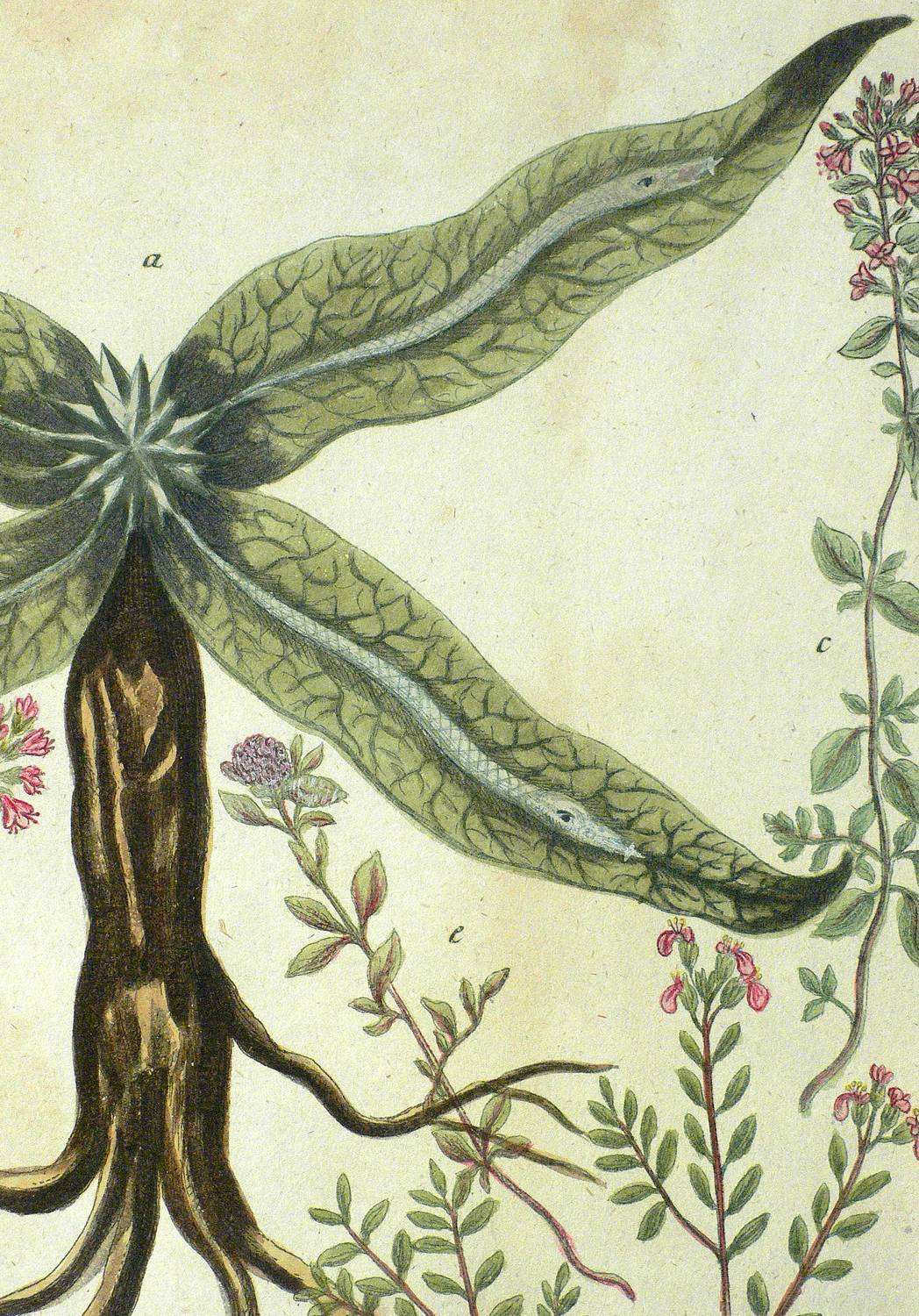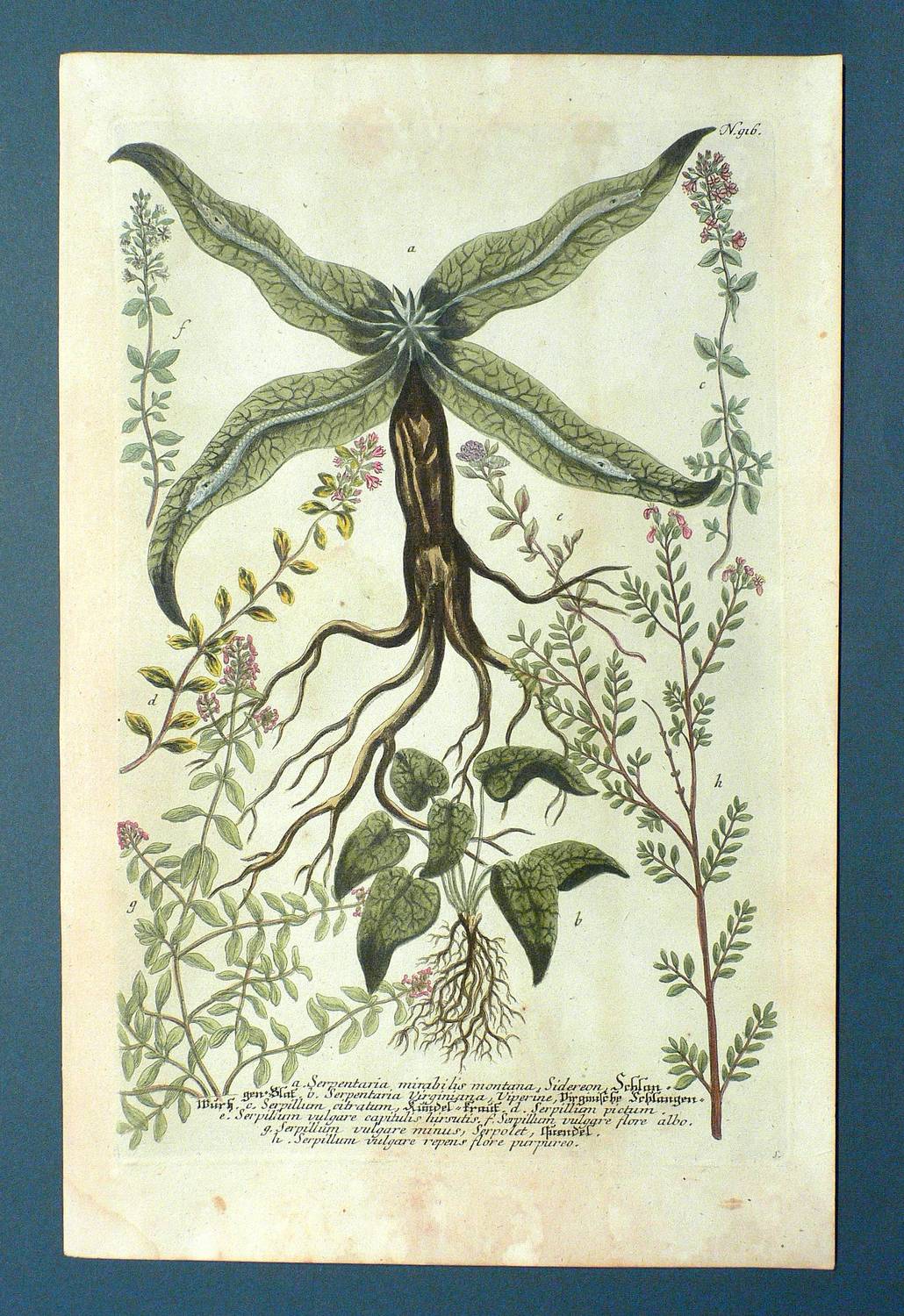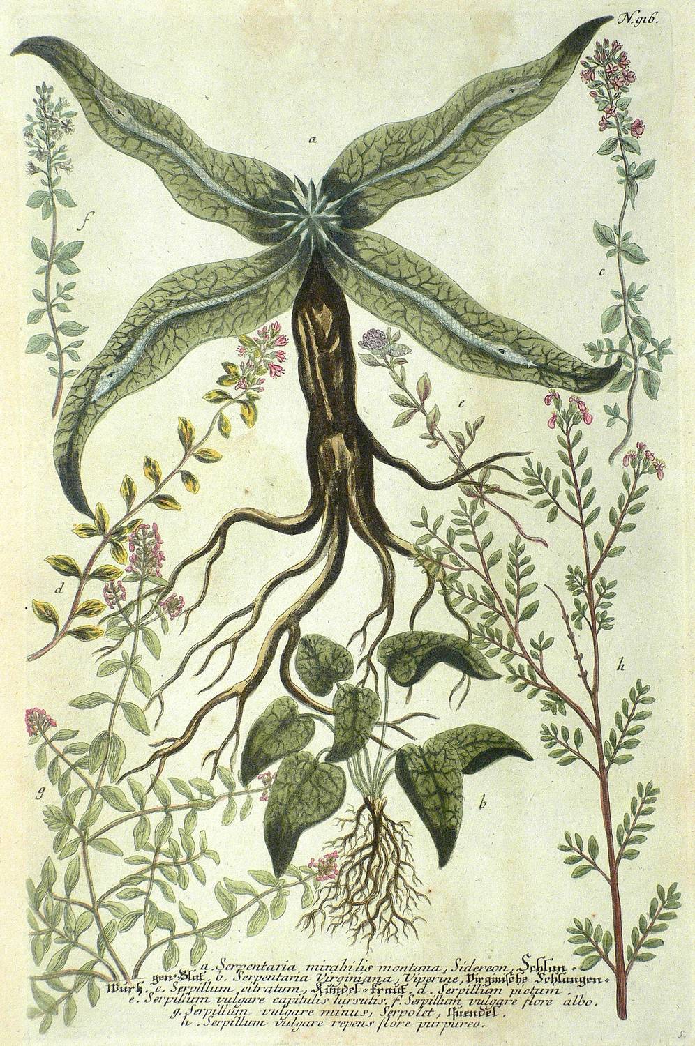 Thymiane (Thymus). – Weinmann. – „Schlangen-Blat. Virginische Schlangen-Wurtz. Kundel-Kraut. Quendel”.